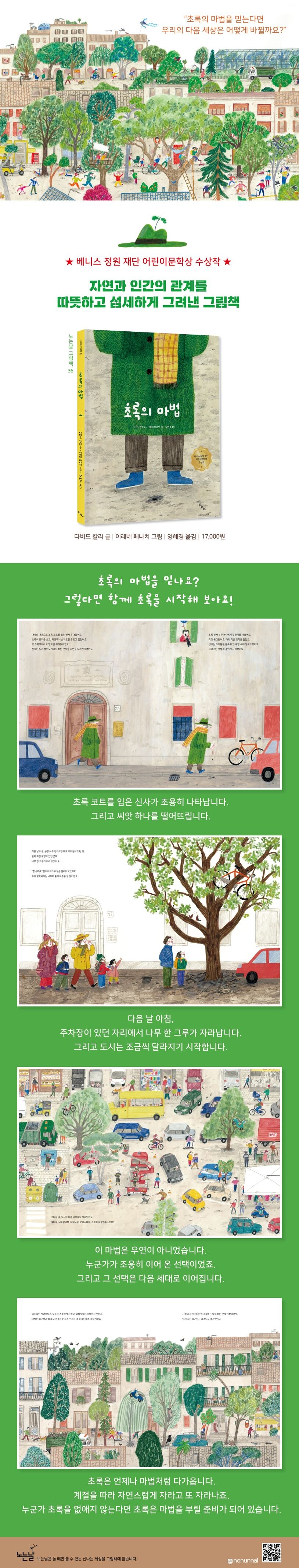 초록은 언제나 마법처럼 다가옵니다. 계절을 따라 자연스럽게 자라고 또 자라나죠. 누군가 초록을 없애지 않는다면 초록은 마법을 부릴 준비가 되어 있습니다. 작가는 독자들에게 전합니다. 초록을 믿는다면 그 자리에서 초록을 시작해 보라고요.