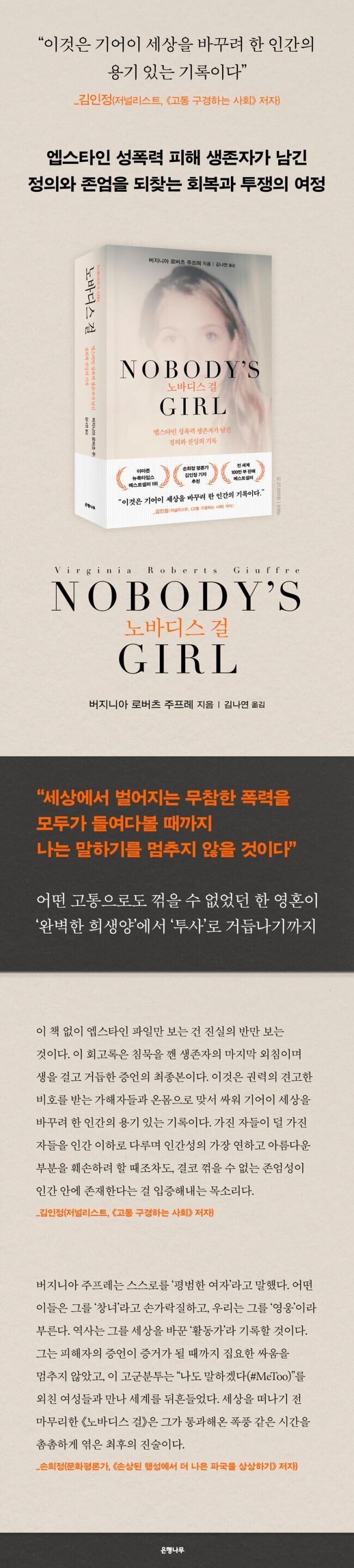 버지니아 주프레는 2025년 4월, 오랫동안 트라우마에 시달리다가 안타깝게도 스스로 목숨을 끊었다. 엡스타인이 감옥에서 사망하고 맥스웰은 감옥에 갇혔지만, 여전히 그들과 같은 아동성폭력범들은 버젓이 세상을 활보하고 있었으니 그녀의 고통과 실망이 얼마나 컸을지 짐작하기조차 어렵다. 그녀는 ‘단 하나의 삶이라도 지켜내기를’ 바라며, 자신이 죽더라도 꼭 《노바디스 걸》을 출간해 달라는 편지를 남겼다. 이 책을 펼치는 것은 그녀의 소명에 부응하여 여성의 인권과 사회정의를 위한 중요한 발걸음을 내딛는 일일 것이다.