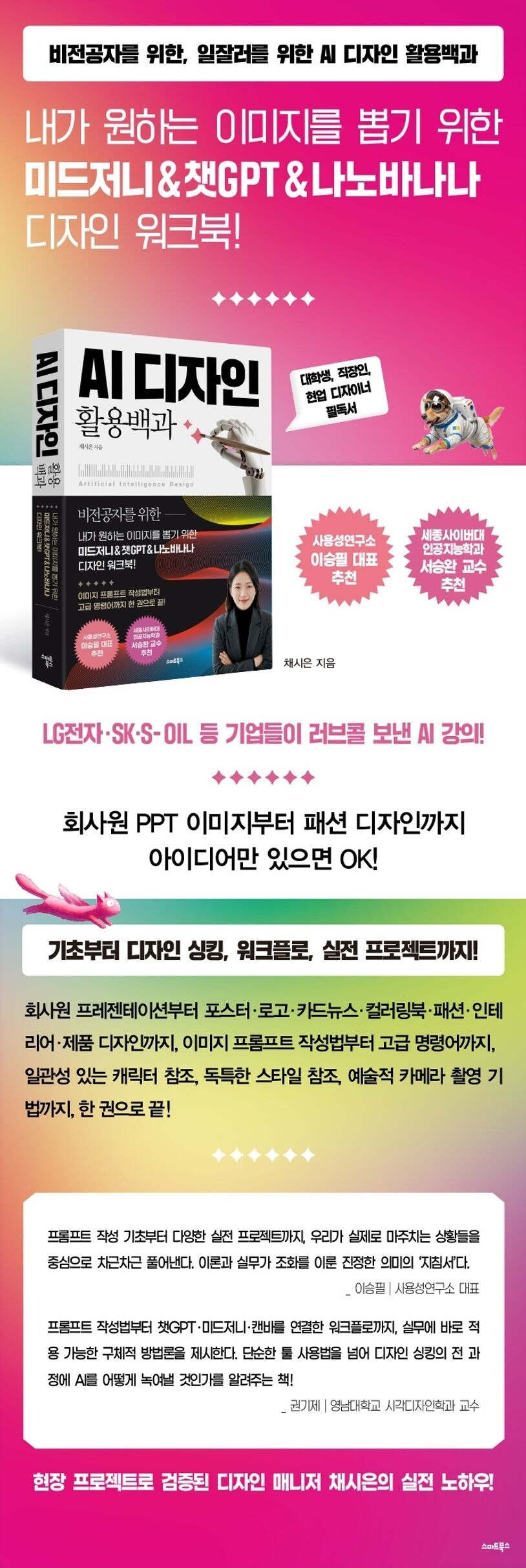 『AI 디자인 활용백과』에는 실제 디자인 매니저인 저자 채시은이 다양한 기업 현장에서 강의를 하며 들은 현장의 요구와, 기업들과 프로젝트를 진행하여 얻은 노하우가 담겨 있다.