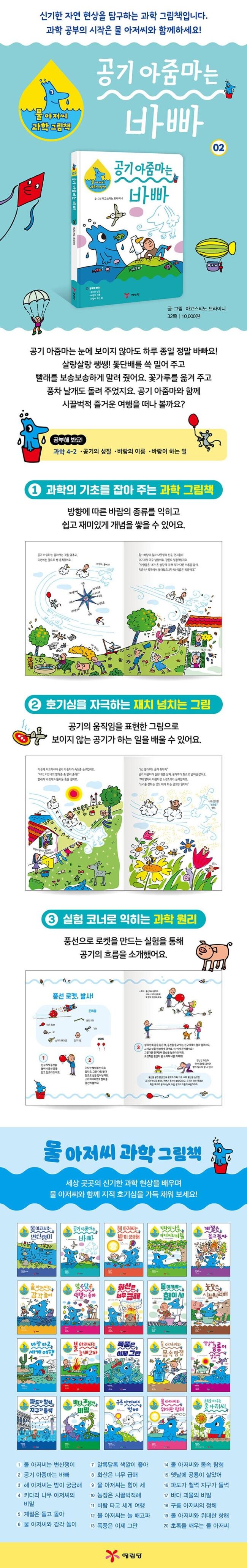 이탈리아의 인기 작가, 아고스티노 트라이니의 [물 아저씨 과학 그림책] 시리즈를 소개합니다. 세상 곳곳의 과학 현상을 배우며 지적 호기심을 가득 채워 보세요! [물 아저씨 과학 그림책]은 신기한 자연 현상을 탐구하는 과학 그림책입니다. 물, 공기, 해 같은 자연물을 주인공으로 삼아 자연스럽게 이야기를 풀어냅니다. 과학을 처음 시작하는 어린이도 과학 원리를 쉽게 이해할 수 있습니다.