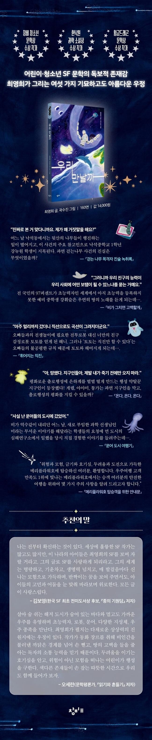 제11회 푸른문학상, 제1회 한낙원 과학소설상, 제8회 창비 청소년 문학상, 제3회 한국 SF어워드 단편부문 우수상, 제5회 교보스토리공모전 장편부문 우수상, 제7회 황금가지 ZA문학상 우수작, 2023년 보슬비SF 동화부문 추천, 제5회 황금가지 타임리프 공모전 우수상, 제5회 황금드래곤 문학상 등을 수상한 한국의 대표 동화 작가인 최영희가 새로운 SF 동화집 『우리 만날까』(창비교육 2026)로 독자들을 만난다. 어린이·청소년 문학가이자 장르 소설가인 최영희는 매 작품마다 새로운 소재로 서사를 창조하고 시공을 확장하며 작품성과 문학성, 재미를 겸비한 작품을 연달아 발표하고 있다. 이번에 출간한 『우리 만날까』는 특히 그의 어린이문학 세계의 정수라 할 수 있는 SF 동화 여섯 편을 모은 작품집이다.