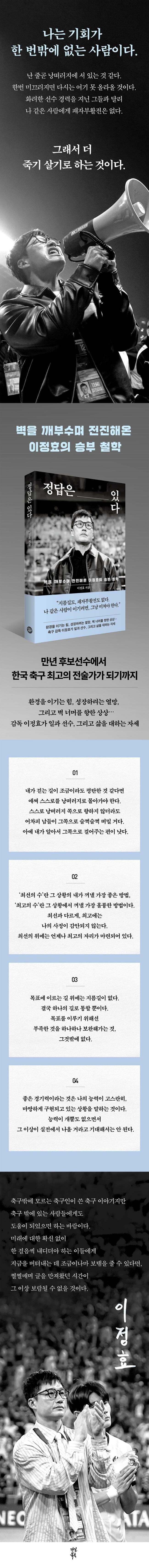 이 책은 지금 한국 축구에서 가장 뜨거운 이름인 이정효의 첫 책이다. 한 온라인서점에서 출간을 2주나 앞두고 책의 출간을 예고하는 ‘신간 알림 페이지’에 댓글이 1천 개나 달렸을 만큼 이미 출간 전부터 큰 화제를 몰고 오고 있다. 이정효가 선수와 지도자로서 축구를 해오며 쌓아온 승부 철학을 정리한 이 책은, 그가 광주 FC에서의 감독 1기를 정리하는 동시에 수원 삼성 블루윙즈에서의 2기를 앞두고 당당히 내미는 출사표라 할 수 있다.
