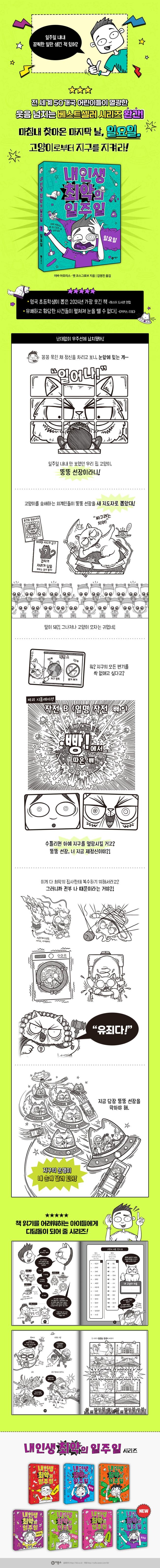 책이 어렵고 지루하다는 편견이 있는 어린이라도 「내 인생 최악의 일주일」 시리즈를 본다면 쿡쿡 터져 나오는 웃음을 참을 수 없을 것이다. 만화 일러스트가 곳곳에 들어가 긴 글을 읽기 힘들어하는 어린이의 부담을 줄여 준다. 현란한 컬러 그림이 가득한 학습 만화에서 줄글 책으로 넘어가는 디딤돌이 되어 주는 시리즈다.