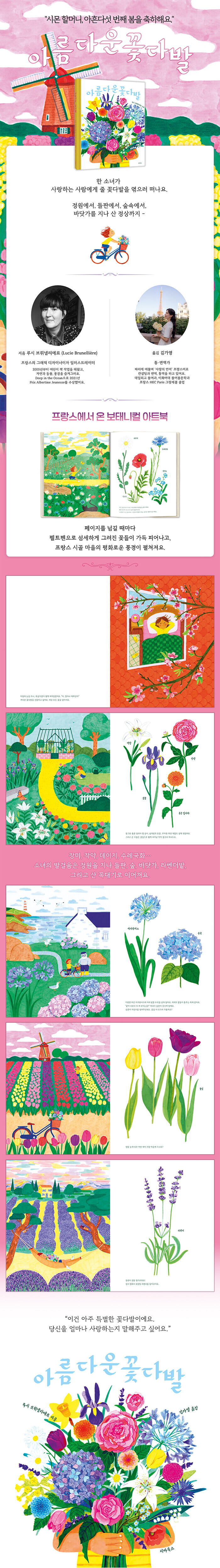 이 책의 가장 큰 매력은 단연 그림이다. 작가는 펠트펜이라는 독특한 기법으로 꽃과 자연 풍경을 세밀하게 그려냈다. 작가는 밑그림을 프로크리에이트로 작업한 뒤 실제 크기로 출력하고, 라이트박스 위에서 펠트펜으로 한 장 한 장 직접 그렸다. 장미, 작약, 수국, 달리아, 라벤더, 에델바이스… 페이지를 넘길 때마다 봄을 알리는 꽃 축제가 다채롭게 펼쳐진다. 소녀가 꽃을 찾아 떠나는 여정은 프랑스 시골의 풍경을 따라간다. 정원에서 시작해 들판을 건너고, 숲을 지나, 바닷가를 걸어서 라벤더밭과 산 정상까지 이르는 이 여정은 마치 프랑스 남부의 작은 마을을 여행하는 기분을 선사한다. 꽃 세밀화 옆에 적힌 이름을 알아가는 재미도 더해진다. 향기로운 꽃다발로 세대를 잇는 따뜻한 이야기가 독자들에게 행복을 전해주기를 바란다.