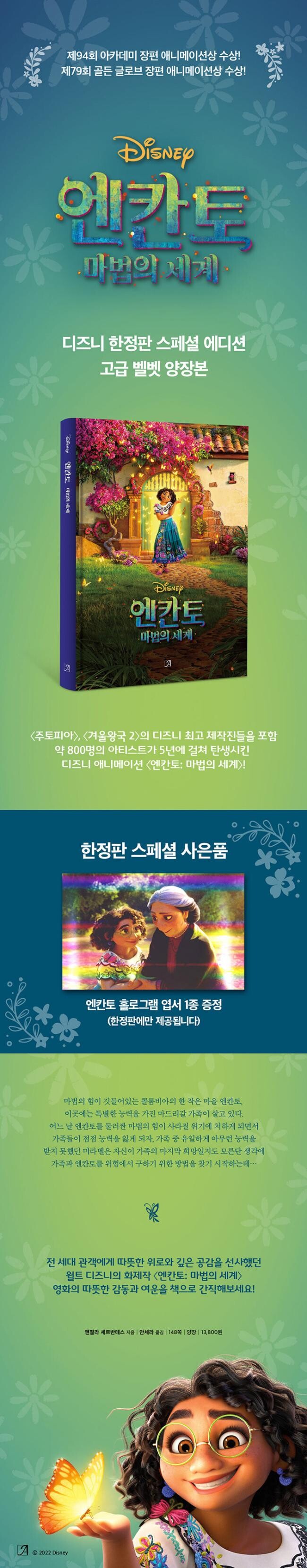 《디즈니 엔칸토: 마법의 세계》는 특별한 능력을 가진 마드리갈 가족 중 유일하게 평범한 ‘미라벨’이 마법이 사라질 위기에 처한 마을 엔칸토와 가족을 구하는 이야기를 다룬 책이다.