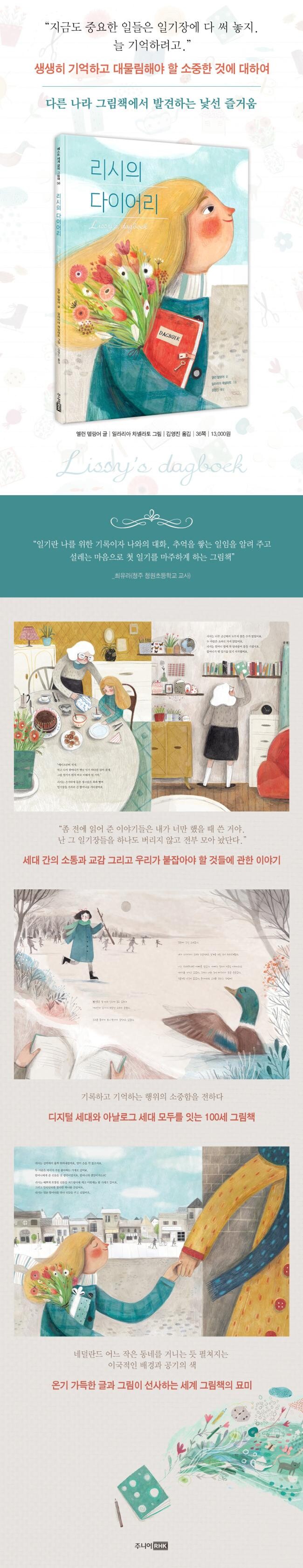유럽의 어느 골목과 가정집을 그대로 옮겨 놓은 듯한 이국적인 배경, 그곳의 공기를 머금은 듯한 색감, 그리고 문학적 감동을 생생히 전하는 완역까지, 《리시의 다이어리》는 독자들에게 완성도 높은 세계 그림책에서만 맛볼 수 있는 생경하고도 즐거운 독서 경험을 선사할 것이다.