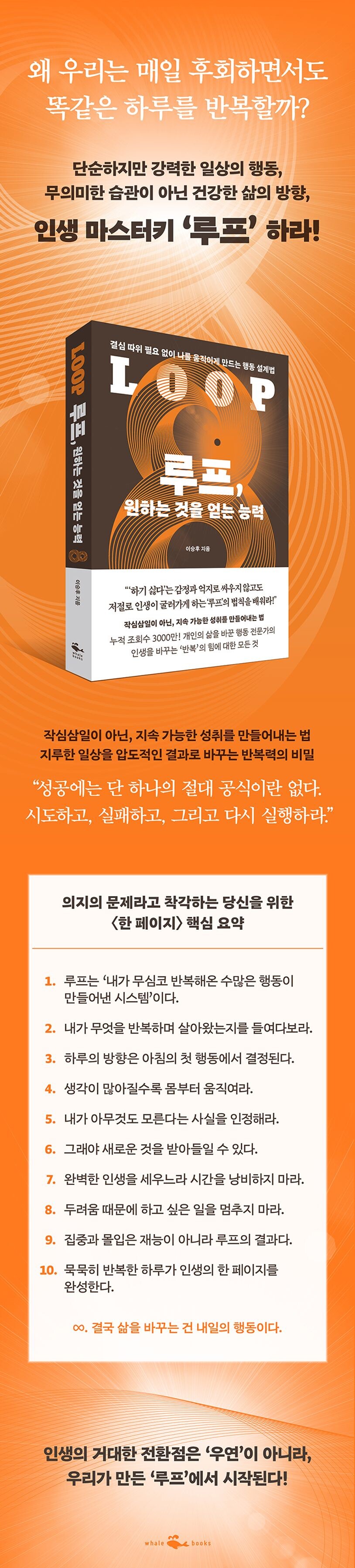 하루를 바꾸고 인생을 원하는 방향대로 흘러가게 하고 싶다면 자신의 의지를 탓하는 것이 아니라, 나를 작동시키는 내 안의 ‘시스템’을 살펴봐야 한다. 이 책은 습관(점)과 루틴(선)을 넘어선 ‘루프(원)’라는 새로운 개념을 통해 삶을 과학적으로 재설계하는 법을 제안한다. 개인 성장 전략가이자 자기계발 전문가인 이승후 저자는 당신이 변하지 못한 건 노력이 부족해서가 아니라, 부정적인 루프가 강력하게 당신을 붙들고 있었기 때문이라고 말한다.
