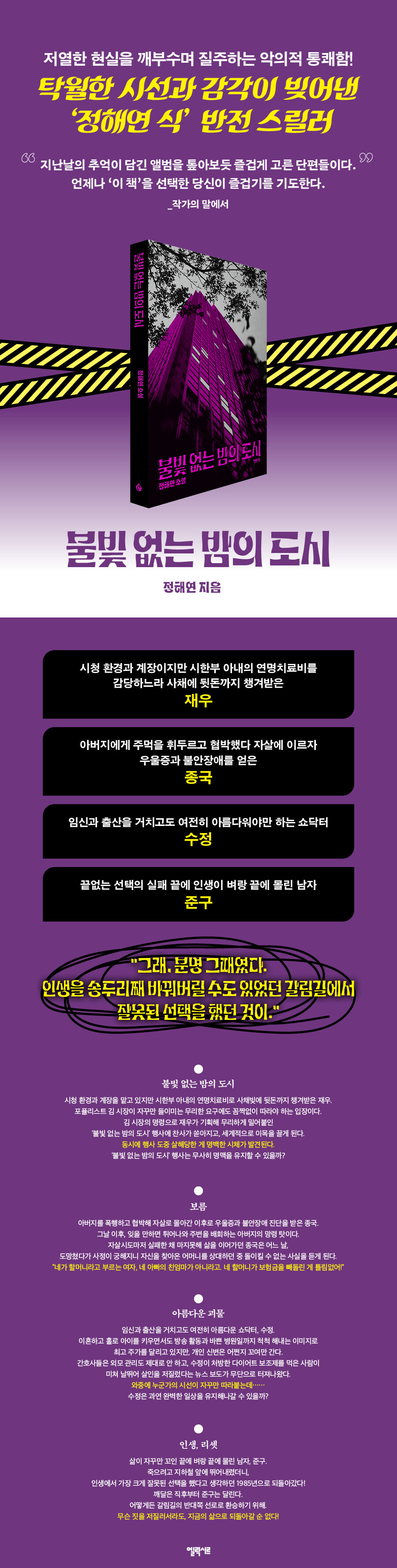 출간 후 20만 부 판매!『홍학의 자리』 정해연의 독보적인 발자취저열한 현실을 깨부수며 질주하는 악의적 통쾌함!탁월한 시선과 감각이 빚어낸 ‘정해연 식’ 반전 스릴러“지난날의 추억이 담긴 앨범을 톺아보듯 즐겁게 고른 단편들이다.언제나 ‘이 책’을 선택한 당신이 즐겁기를 기도한다.”_작가의 말에서시청 환경과 계장이지만 시한부 아내의 연명치료비를 감당하느라 사채에 뒷돈까지 챙겨받은 재우. 주먹을 휘두르며 협박한 아버지가 자살에 이르자 우울증과 불안장애를 얻은 종국. 임신과 출산을 거치고도 여전히 아름다워야만 하는 쇼닥터, 수정. 반복된 선택의 실패 끝에 인생이 벼랑 끝에 몰린 남자, 준구.네 가지 장르, 네 가지 재미를 제공하는 정해연 작가의 엔터테인먼트 스릴러 걸작선!“그래, 분명 그때였다.인생을 송두리째 바꿔버릴 수도 있었던 갈림길에서 잘못된 선택을 했던 것이.”경악의 반전 스릴러 『홍학의 자리』, 보기 드문 특수 설정 스릴러 『못 먹는 남자』, 액션, 범죄, 블랙 유머가 완벽한 삼중주를 이루는 『2인조』에 더해 드라마화된 『유괴의 날』을 포함한 ‘날 시리즈’ 등으로 출간하는 작품마다 독자와 평단의 주목을 받는 정해연 작가의 강렬한 신작. 『불빛 없는 밤의 도시』는 엘릭시르에서 출간하는 정해연 작가의 첫번째 소설집으로, 모든 단편이 인상적인 설정과 주저하지 않는 전개, 예상치 못한 곳에서 치고 들어오는 반전을 품고서 이야기의 한계를 향해 질주한다.정해연 작가는 저열한 인물들의 불유쾌한 심리 전반을 끈덕지게 따라붙으며, 독자가 예상치 못한 진실과 마주하도록 유도하는 이야기를 집필해왔다. 특히 단편소설에서는 현실적인 악의로 똘똘 뭉친 인물들을, 작가 특유의 집요하리만치 세심하게 짜여진 설계로 무참히 깨부순다. 언뜻 무의미한 듯 정교하게 소설 곳곳에 내리깔린‘정해연 식’ 반전을 위한 포석은, 이번에는 별거 없다고 갸웃거릴 때쯤이 되어서야 읽는 이의 뒤통수를 강렬하게 치고 지나간다. 신작 『불빛 없는 밤의 도시』는 상식적 믿음을 깨부수는 정해연 작가 특유의 파괴적 반전이 가득하다. 『홍학의 자리』 이후, 한국 장르문학의 새로운 지표로 떠오른 정해연 작가가 그러모은 어둑한 즐거움의 재미를 이번 소설집을 통해 만끽하시길 바란다.‘현실적 빌런’들에게 들이닥치는 파괴적 반전“막을 수 있는 일? 살의라는 건 당사자가 아니면 일이 벌어지고 나서야 타인이 인식하는 겁니다.그럼 뭘 해야 할까요? 괜히 책임 떠넘길 곳 찾는 게 아니라, 살인자를 밝혀야죠.”한국 스릴러의 살아 있는 전설, 정해연 작가의 신작 소설집 『불빛 없는 밤의 도시』가 엘릭시르에서 출간되었다. 여러 창구를 통해 항상 즐거움을 가장 중요시한다고 밝혀온 작가는 이번 소설집에서도 변함없이 특기인 파격적인 설정과 뒷골을 서늘하게 만드는 반전을 서슴없이 내보이는 네 편의 작품을 손수 골라내고, 배치했다. 네 단편의 주인공은 모두 ‘현실적인 수준에서 불쾌하다’는 의미로 비슷한 인간상이고, 그렇기에 모조리 예상치 못한 난관을 맞이한 끝에 파멸한다. 바로 그것이 이 소설집에 포함된 모든 단편의 재미이자 추동력이 된다.표제작이자 맨 앞에 배치된 「불빛 없는 밤의 도시」의 주인공, 재우는“매일이 똑같은 것을 좋아”하지만 도무지 그게 안 되어 결국 자신의 일상을 스스로 파괴하고 마는 인물이다. 여러 상황과 시점이 삽시간에 배치되며 진행되는 이 단편은 재우가 처한 더없이 끔찍한 상황, 그에 저항하지 않고 오히려 끝없는 수렁으로 걸어들어가는 와중 면피용으로 늘어놓는 자기변명, 그로 인해 스스로 손에 묻힌 타인의 피가 마지막을 장식할 정도로 호락호락하게 끝나지 않는다는 점에서 반전 스릴러의 또다른 가능성을 탐색한다. 자신이 아버지에게 폭력과 폭언을 쏟아부어 음독자살하게 만들었다는 죄악감에서 벗어나지 못해 정상적인 사회생활이 어려울 정도로 병들어버린 「보름」의 종국은 자신을 버리고 떠난 어머니와 있는 줄도 몰랐던 배다른 동생을 함께 조우한 것을 계기로 한번 알면 이전으로 돌아갈 수 없을 정도로 끔찍한 진실에 직면한다. 5년 전 이미 죽었는데도 종국에게만 계속 보인다는 아버지의 망령이 도대체 어떤 의미를 가졌는지가 밝혀지는 순간, 독자가 파악해뒀던 선과 악은 완전히 전복되며, 호러와 스릴러는 큰 위화감 없이 접붙는다.앞선 두 작품과는 달리 이후의 내용과 어떤 연관성이 있는 건지를 쉽사리 가늠하기 어려운 우발적 살인 사건이 장식하는 「아름다운 괴물」은 얼핏 주인공인 듯 비춰지던 인물이 갑작스럽게, 별 이유도 없이 살해당하며 사라진 뒤 완전히 다른 톤으로 재시작한다. ‘프롤로그’와 이후 등장하는 이야기의 주인공, 수정 사이의 연결고리가 완전히 밝혀지는 순간, 작중 등장인물들이 마주한 파멸적 결말에서 기인하는 현실감과 더불어 촘촘한 설계 끝에 ‘반전 코드’의 정체가 완전히 모습을 드러낸다. 이후의 전개는 작가의 특기인 날카로운 반전 너머로 브레이크 없이 질주하며, 현실에서 으레 겪곤 하는 악의가 삶을 어디까지 파괴할 수 있는지를 