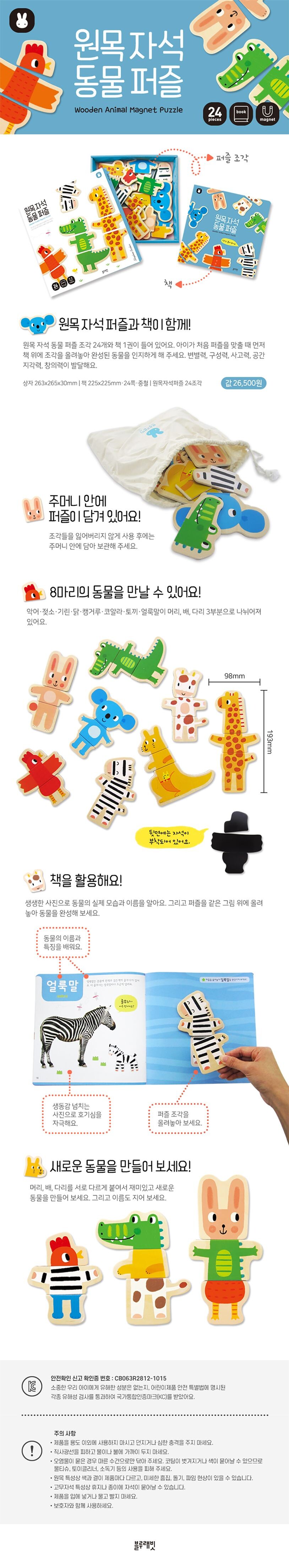 책을 펴서 동물의 이름을 알고, 그림 위에 머리, 배, 다리 퍼즐 조각 3개를 올려 놓아 동물을 완성해 보아요. 그런 다음, 자석칠판에 퍼즐 조각을 착착 붙여 악어, 젖소, 기린, 닭, 캥거루, 코알라, 토끼, 얼룩말을 맞춰 보세요. 또 머리-배-다리를 서로 다르게 맞춰서 새로운 동물을 만들어 보세요. 손을 움직이며 퍼즐을 맞추면 눈과 손의 협응력, 변별력, 구성력, 사고력, 공간지각력, 창의력이 발달해요.