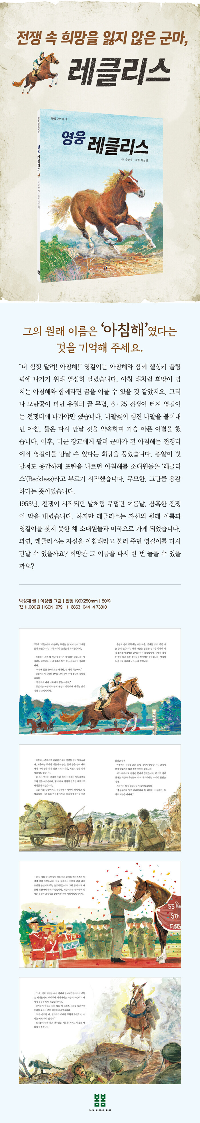 레클리스는 원래 서울의 한 경마장을 힘차게 달리던 암말, ‘아침해’였습니다. 경마장을 달리던 아침해는 전쟁으로 인해 전쟁터를 달리게 되고, 이름도 희망찬 아침해에서 용감한 레클리스로 불리게 된 것입니다. 전쟁이 끝난 후 많은 시간이 흘렀지만, 어디에서나 희망을 잃지 않았던 아침해를 오래도록 기억해 주세요.