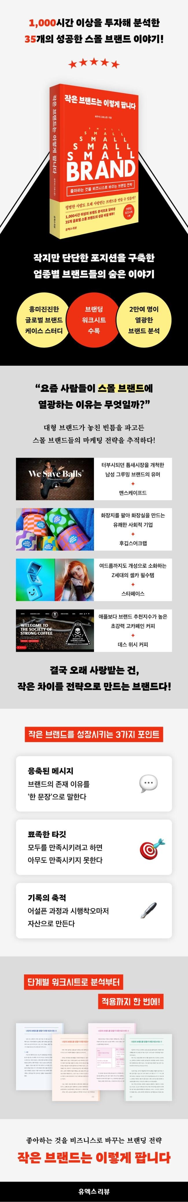 소개된 35개 브랜드에는 세 가지의 공통된 핵심 전략이 있다. 첫째는 응축된 메시지다. 브랜드가 왜 존재하는지 한 문장으로 설명할 수 있을 때 고객은 빠르게 반응한다. 둘째는 좁지만 뾰족한 타깃 설정이다. 모두를 만족시키기보다는 강하게 공감하는 집단을 먼저 확보하며 시장 내 존재감을 만든다. 셋째는 기록의 축적이다. 제품 개발 과정, 시행착오, 성장 과정까지 꾸준히 공유하면서 브랜드 서사를 구축한다. 이 책은 이런 공통 구조를 통해 스몰 브랜드가 어떻게 시장 안에서 확실한 위치를 확보하고, 이후 더 넓은 시장으로 확장해 가는지를 입체적으로 보여 준다.