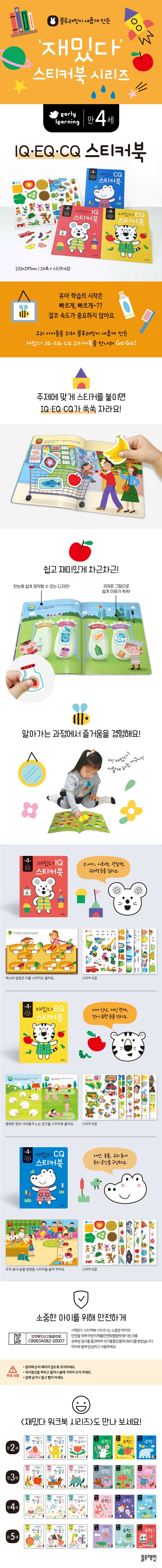 <재밌다 스티커북 시리즈>는 재밌다!유아 학습의 시작은 빠르게, 빠르게~??결코 속도가 중요하지 않아요.<재밌다 스티커북 시리즈>는 아이가 스티커를 붙이면서 집중력과 관찰력, 창의력을 경험하며자연스럽게 놀이하듯 차근차근 알아가는 재미를 느낄 수 있습니다.<재밌다 IQ 스티커북>은아이들이 가장 좋아하는 놀이로 꼽히는 스티커 놀이를 통해 논리적 사고와 수리력, 어휘력, 추리력 등을자연스럽게 키울 수 있습니다. 유아에게 부담을 줄 수 있는 '공부'라는 틀을 벗어나 친구한 놀이로접근하는 스티커북은 IQ 발달을 위한 학습의 첫걸음을 쉽게 뗄 수 있도록 이끌어 줄 것입니다.<만 4세 재밌다 IQ 스티커북>은유아의 주변에서 자주 볼 수 있는 과일과 야채, 동물, 음식 등의 이름을 알고, 상황에 따라 필요한 사물을유추해 봅니다. 장소에 따른 다양한 탈것, 맛과 촉감에 대한 언어, 1부터 50까지 수 세기, 10단위의 수 세기,위와 아래 등 공간에 대한 이해, 일부를 보고 전체를 유추하는 추리력 등을 재미있는 스티커 활동을 통해자연스럽게 익히도록 구성되어 있습니다.