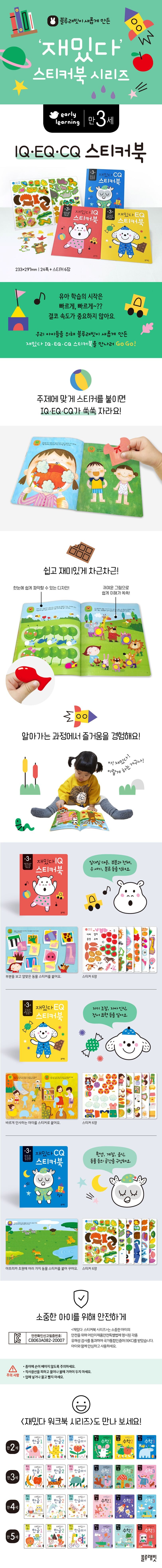 <재밌다 스티커북 시리즈>는 재밌다!유아 학습의 시작은 빠르게, 빠르게~??결코 속도가 중요하지 않아요.<재밌다 스티커북 시리즈>는 아이가 스티커를 붙이면서 집중력과 관찰력, 창의력을 경험하며자연스럽게 놀이하듯 차근차근 알아가는 재미를 느낄 수 있습니다.<재밌다 EQ 스티커북>은아이들이 가장 좋아하는 놀이로 꼽히는 스티커 놀이를 통해 자기의 감정과 행동을 조절하는 능력,다른 친구의 감정을 이해하는 능력, 자연을 품에 안는 따뜻함 등을 자연스럽게 키울 수 있습니다.유아에게 친근한 놀이로 접근하는 스티커북은 EQ 발달의 가장 빠른 지름길입니다.<만 3세 재밌다 EQ 스티커북>은장난감을 정리하고 이를 닦는 습관을 기릅니다. 몸에 좋은 음식과 나쁜 음식에 대해 알고,친구나 어른에게 인사하는 올바른 방법을 익히며, 앞서 제시된 물건 중 사라진 물건을 기억하여스티커를 붙이는 활동을 통해 주의력과 집중력을 기릅니다. 또한 수영장이나 병원 등 유아가자주 접할 수 있는 공공장소에서의 바른 행동 등을 재미있는 스티커 활동을 통해 자연스럽게익히도록 구성되어 있습니다.