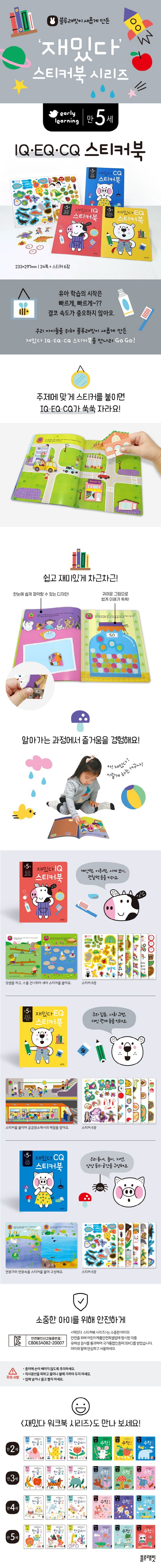 <재밌다 스티커북 시리즈>는 재밌다!유아 학습의 시작은 빠르게, 빠르게~??결코 속도가 중요하지 않아요.<재밌다 스티커북 시리즈>는 아이가 스티커를 붙이면서 집중력과 관찰력, 창의력을 경험하며 자연스럽게 놀이하듯 차근차근 알아가는 재미를 느낄 수 있습니다.<재밌다 CQ 스티커북>은놀이만큼 아이의 상상력과 호기심을 자극하는 것은 없습니다. 게다가 그것이 아이가 가장 좋아하는 놀이로 손꼽는 스티커 놀이라면 더할나위 없겠지요. 아이의 CQ를 자극하여 발달 시키는 기본 요소는 재미와 상상력, 자유로움입니다. 스티커북은 놀이를 통한 생각의 표현으로 유아의 흥미와 호기심을 자극하고 상상력을 마음껏 펼칠 수 있는 최고의 친구가 되어줄 것입니다.<만 5세 재밌다 CQ 스티커북>은봄비가 내리는 풍경 표현하기, 자연과 계절, 놀이, 우리 동네 등에 대한 자유로운 표현력을 기르고, 내가 만약 탐험가가 된다면 혹은 내가 만약 우주인이 된다면 등 상상력을 펼칠 수 있는 내용으로 구성되어 있습니다. 유아의 호기심을 자극하고 흥미를 북돋을 수 있는 다양한 스티커 붙이기 활동을 통해 자연스럽게 창의적인 사고를 키울 수 있습니다.