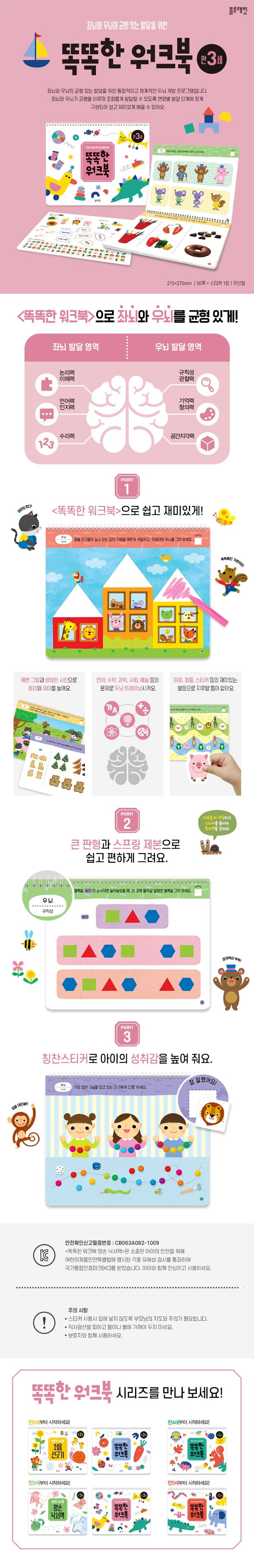 좌뇌와 우뇌의 균형 있는 발달을 위한 똑똑한 워크북!좌뇌는 논리적, 분석적, 합리적인 ‘언어의 뇌’, 우뇌는 종합적, 창의적, 직관적인 ‘이미지의 뇌’라고 알려져 있어요. 그렇다면 수학 문제를 해결하는 데는 좌뇌만 있으면 되는 걸까요? 또 악기를 연주하는 창의적인 활동은 우뇌만 있으면 가능한 걸까요?[똑똑한 워크북]은 우리 아이들의 고른 두뇌 발달을 위해 연령별 두뇌 활용도를 고려한 체계적인 프로그램으로, 좌뇌와 우뇌가 조화를 이루며 통합적으로 발달할 수 있도록 도울 것입니다. 한 권 안에 좌뇌 발달 영역인 논리력, 이해력, 언어력, 인지력, 수리력과 우뇌 발달 영역인 규칙성, 관찰력, 기억력, 창의력, 공간지각력의 고른 학습을 할 수 있어 좌뇌와 우뇌의 균형 있는 발달을 돕지요. 또한 학습이 끝날 때마다 붙여 주는 칭찬 스티커는 아이의 의욕을 쑥쑥 길러 줍니다.편리한 빅사이즈 스프링 제본큼지막한 판형으로 문제를 이해하고 해결하기에 좋아요. 그리고 편리한 스프링 제본으로, 책장을 넘길수록 가운데 부분이두꺼워져 바르게 글씨 쓰기가 힘든 불편함을 없앴어요. 이제 바르게 펴서 편하게 공부하세요!소중한 아이를 위해 책 한 권도 안전하게아이들이 책 모서리에 찔리거나 손이 베이는 사고를 피할 수 있도록 모서리를 둥글게 처리했어요.또한 어린이제품안전특별법에 명시된 각종 유해성 검사를 통과하여 KC인증을 받았습니다.안전성이 검증된 책으로 안심하고 즐겁게 사용하세요.