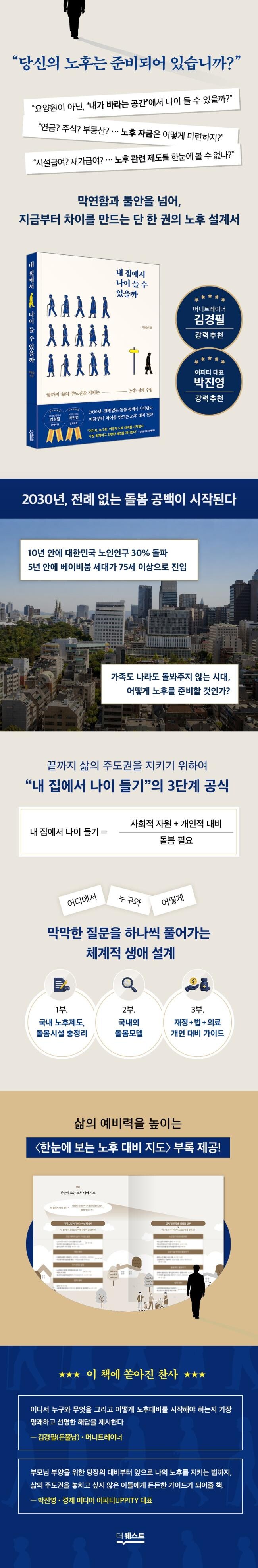 뿔뿔이 흩어진 노년 관련 정보를 총망라한 이 책은, 독자가 스스로 ‘최소한의 노후 안전망’을 구축하며 끝까지 자신의 삶을 결정할 힘을 길러준다. 정년은 짧아지고 수명은 길어지는 시대. 이 책은 부모님의 부양을 고민하기 시작한 이들부터 자신의 노년을 준비하기 시작한 세대까지, 모든 이에게 가장 선명하고 든든한 생애 설계 안내서가 되어줄 것이다.