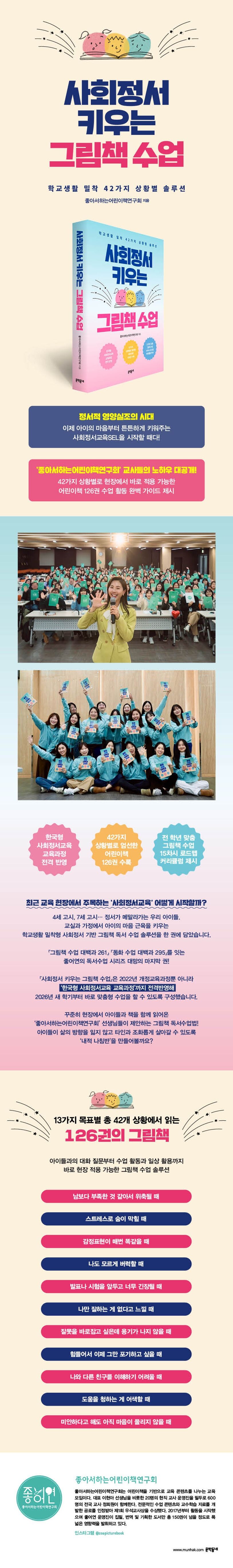 다년간 교실에서 진행한 독서수업의 노하우를 전해온 좋어연 교사들이 이번에 주목한 것은 2026년부터 본격적으로 현장에 도입되는 ‘한국형 사회정서교육(K-SEL)’이다. 2025년부터 시범 운영됐지만 많은 교사들이 사회정서교육을 어떻게 현장에 적용해야 할지 막막하다고 이야기한다. 이에 좋어연 운영진 교사들이 모여 1년간 사회정서교육 기반 그림책 수업을 치열하게 연구해 그 결과를 이 책에 담았다. 2022년 개정 교육과정뿐 아니라 미국의 사회정서학습협회(CASEL)의 5대 사회정서 핵심 역량, 교육부에서 발표한 한국형 사회정서 역량까지 고려해 126권의 그림책을 주제별로 선별했다. ‘남보다 부족한 것 같아서 위축될 때’ ‘발표나 시험을 앞두고 너무 긴장될 때’ ‘나만 잘하는 게 없다고 느낄 때’ ‘잘못을 바로잡고 싶은데 용기가 나지 않을 때’ 등 교실에서 접하는 42가지 갈등 상황을 주제로 각 상황에 맞춤한 그림책을 엄선했다. 선정한 그림책은 ‘수업 목표 안내하기-사회정서 기술 익히기-연습 및 적용하기’의 3단계로 체계화해 아이들이 자신의 마음을 천천히 들여다보고 스스로 해결책을 찾을 수 있게끔 구성했다. 42가지 갈등 상황에 맞는 그림책 수업 솔루션 외에도 전 학년 맞춤 15차시 로드맵 커리큘럼, 252권의 주제별 추천 도서까지 부록으로 알차게 담았다. 『사회정서 키우는 그림책 수업』을 차근차근 현장에서 적용해보면 아이들의 마음 근육도 점점 탄탄해질 것이다.