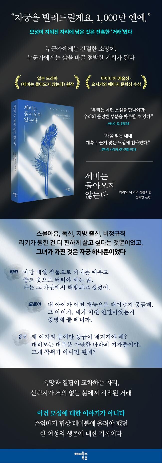 가난은 때때로 삶의 기로에 선 인간에게서 자유의지를 빼앗는다. 자유와 존엄을 지키는 일조차 사치가 되는 순간, 사람은 살아남기 위해 자신의 모든 것을 협상 테이블 위에 올려놓게 된다. 《제비는 돌아오지 않는다》는 몸과 노동, 시간과 미래까지도 거래 가능한 자원이 되는 세계를 그려낸다.