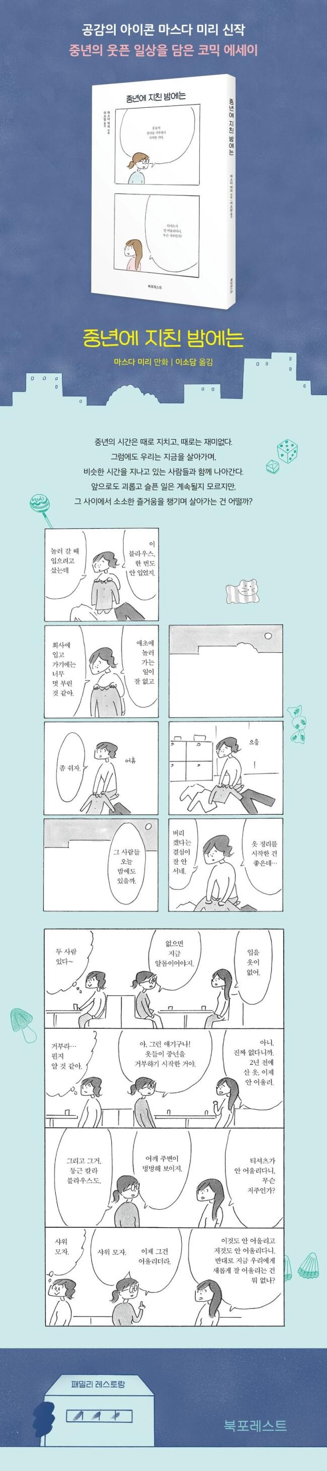 『중년에 지친 밤에는』은 바로 그 순간들을 포착한다. 단어가 금방 떠오르지 않아 “그거, 그거”를 반복하게 되는 일, 이야기를 꺼냈다가 “전에 들었거든”이라는 말을 듣는 순간, 몸을 일으킬 때마다 자연스럽게 붙는 “영차”, 그리고 새로운 관계보다 ‘지인’이 편해지는 마음까지. 사소하지만 분명한 변화들이 또렷하게 그려낸다.