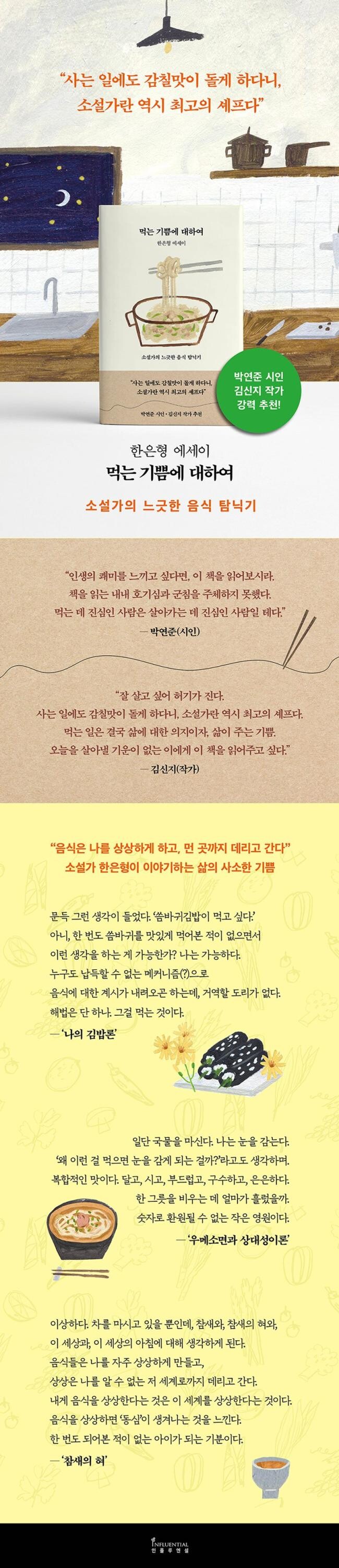 누군가는 물을지 모른다. 고작 음식 이야기 아니냐고. 그러나 가장 사소한 일부가 때로는 삶 전체가 되기도 한다. 음식 에세이의 진수를 느낄 수 있는 이 한 권의 책에서 혀끝에서 시작된 감각이 가장 멀리까지 나아가는 순간, 우리는 넓고 깊은 기쁨의 세계를 마주하게 될 것이다. "오늘은 무엇을 먹어서 또 스스로를 기쁘게 할 것인지. 무엇이 되었든, 기쁘게 할 무언가를 드셨으면 좋겠습니다. 슬픔은 잠시 잊고요."(349쪽)