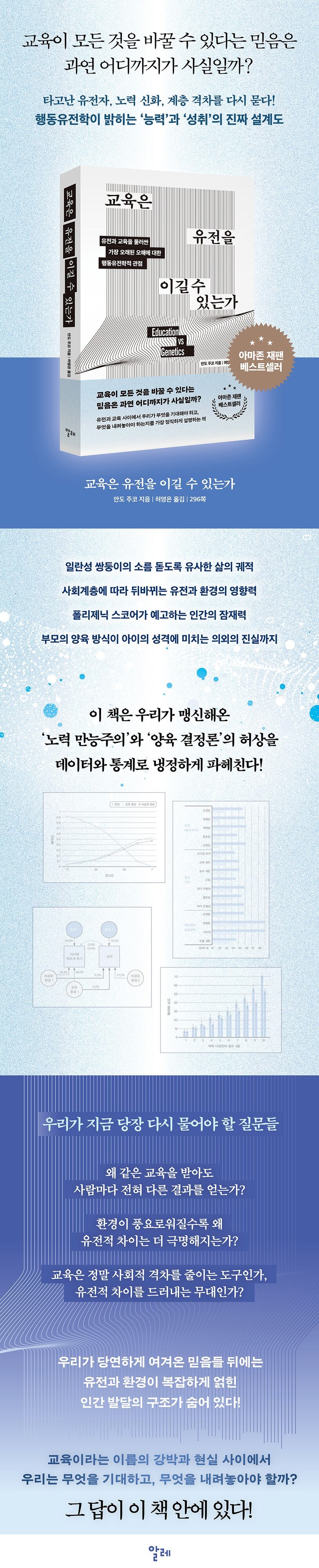 "왜 같은 교육을 받아도 결과는 다른가?", "노력과 교육은 정말로 모든 격차를 해소할 수 있는가?"라는 근본적인 질문에 답합니다. 저자는 지능, 학업 성취, 성격 등 인간의 거의 모든 특성에 유전이 통계적으로 무시할 수 없는 영향(유전율 약 50% 수준)을 미친다는 사실을 명확히 밝힙니다.