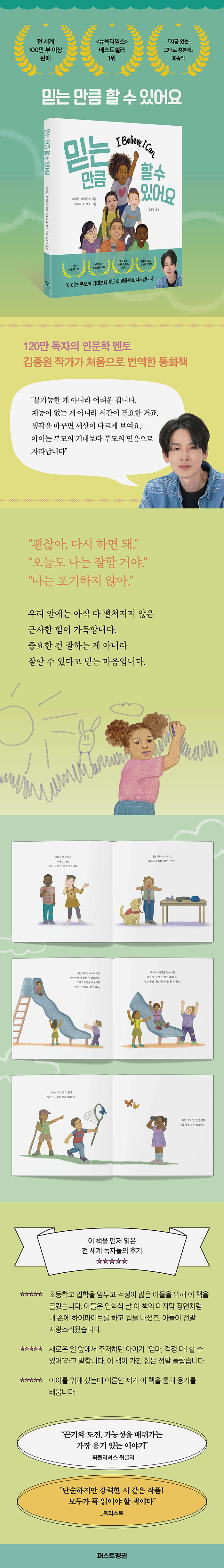 『믿는 만큼 할 수 있어요』는 ‘나는 충분히 소중한 사람입니다’라는 전작의 메시지에서 한 걸음 더 나아갑니다. 이 책의 번역을 맡은 김종원 작가는 우리는 존중받아야 할 존재인 동시에 무엇이든 시도하고 성장할 수 있는 무한한 가능성을 지녔다는 사실을 잊지 말아야 한다고 강조하며, 아이들의 눈높이에 맞춘 다정하고 섬세한 언어로 아이들의 성장을 응원합니다.