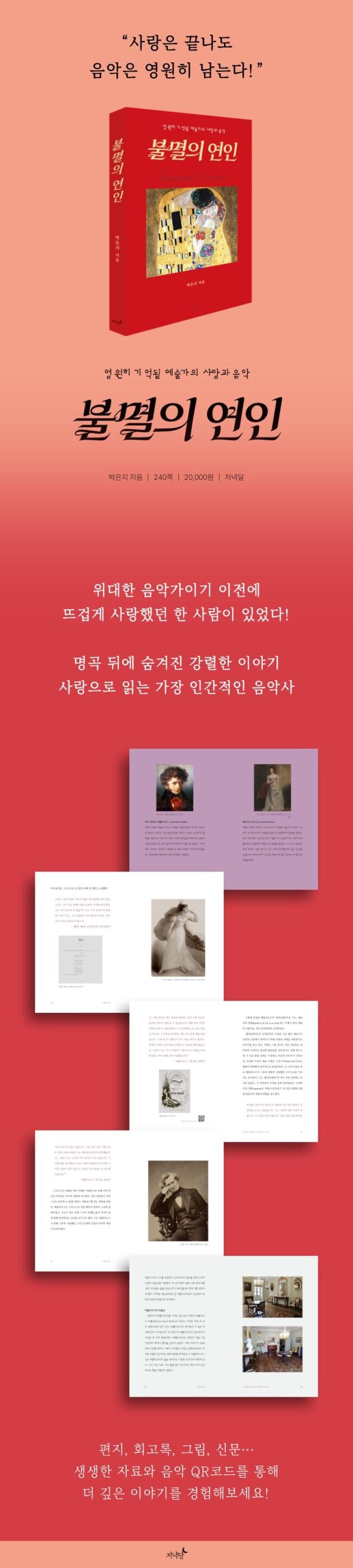 『불멸의 연인』은 당시 각 인물의 상황과 ‘사랑’이라는 감정을 중심으로 클래식 이야기를 풀어낸다. 사회적으로 허용되지 않았던 사랑, 이루어지지 못한 관계, 그리고 그 모든 감정이 음악 속에 남긴 흔적을 통해 독자는 예술과 인간 그리고 사랑의 관계를 깊이 있게 들여다보게 된다. 사랑이 벼락처럼 마음에 내리꽂히던 공연장에서의 첫 만남, 수십 통을 보내도 답장을 받지 못한 편지, 절절한 사랑과 비뚤어진 집착과 이별의 고통, 그리고 창작으로 이어지는 감정의 폭발까지…. 한 사람의 삶과 사랑에 대한 이야기에 홀린 듯이 빠져들어 읽다 보면 어느새 클래식과 한 발 더 가까워졌다는 느낌을 느끼게 된다. 『불멸의 연인』을 통해 클래식이 더 이상 멀고 어려운 장르가 아닌 누구나 공감할 수 있는 이야기로 다가오며, 더욱 폭넓게 이해할 수 있게 될 것이다.