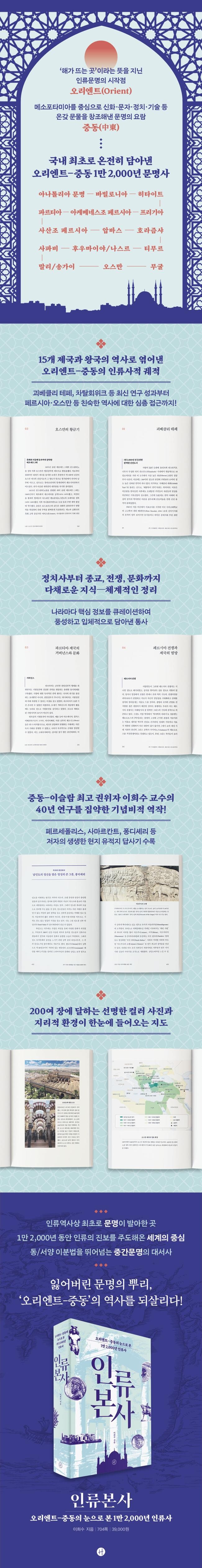 잃어버린 문명의 뿌리, 오리엔트-중동의 역사를 되살리다오리엔트-중동 지역은 위대한 문명의 산실이자, 약 1만 2,000년간 인류의 진보를 주도해 온 역사적 중심축이다. 그러나 세계를 ‘서양’과 ‘동양’으로 갈라 그중에서도 서양의 역사 패턴을 중심으로 인류의 발자취를 추적한 기존의 ‘보편적 역사관’은 정작 인류문명의 뿌리를 간직한 오리엔트-중동을 철저히 외면해왔다. 그 결과 우리는 오늘날 인간사회를 발아시킨 이 지역의 역사와 문화에 관해선 전연 무지한 채로. 불균형하고 단절되고 왜곡된 반쪽짜리 역사인식을 무분별하게 추종하고 재생산해왔다.《인류 본사》는 국내 최고 중동 전문가 이희수 교수가 오리엔트-중동 지역의 역사를 인류의 뿌리 역사, 즉 ‘본사(本史)’로서 선언하며 1만 2,000년 전 초고대 아나톨리아 문명부터 히타이트·프리기아 등 고대 오리엔트 문명과 7세기 이후 이슬람 왕국들의 역사를 거쳐 근대 오스만·무굴 제국의 성쇠까지, 오리엔트-중동의 인류사적 궤적을 완성한 국내 최초의 역작이다. 인류사회의 시원을 개창한 동시에 ‘중간문명’으로서 동/서양의 교류 발전에 심대한 영향을 끼친 오리엔트-중동 지역 15개 제국과 왕국의 역사를 새롭게 정리하여 인류사를 그 핵심과 뿌리에서부터 다시 썼다. 최초의 문명이 발아하고 성숙해온 인류역사의 중심 무대, 동양과 서양을 아우르는 ‘중간문명’의 1만 2,000년 대서사가 펼쳐진다.틀에 박힌 동/서양 이분법을 뛰어넘어‘중양(中洋)’의 눈으로 되찾은 인류문명사의 찬란한 완전판오늘날 ‘역사’라는 개념을 관성적으로 구분하면 누구나 자연스레 ‘서양사’와 ‘동양사’로 나누고 만다. ‘서양사’는 그리스-로마에서 출발해 중세-대항해시대-르네상스-종교개혁을 거쳐 산업혁명과 근대 문명으로 귀결되면서 ‘세계사(世界史)’라는 이름을 독점했고, 동서양의 균형을 내세우며 인위적으로 육성된 ‘동양사’는 중국사 일변도였다. 나머지 세상은 지역사, 변방사, 비주류 역사로 치부되었으며, 서양사와 동양사는 동전의 양면처럼 엄격히 분리된 채 이어져 오다 근대에 이르러서야 ‘서양이 동양을 개화시키며’ 융합되었다는 식으로 말해져 왔다.그러나 이는 속속들이 잘못된 역사인식이다. 서양의 문명과 문물은 서양에서 기원하지 않았고, 동서양은 인류사의 모든 순간을 통틀어 교류하지 않은 적이 없었다. 지구는 동전처럼 평평하지 않았고, 그렇기에 서양과 동양을 촘촘히 이어준 ‘중간문명’이, 더 거슬러 올라가 ‘인류문명’이라는 것 자체를 탄생시킨 ‘중심문명’이 분명하게 존재해왔다. 그저 틀에 박힌 동/서양 이분법에 의해 외면되었을 뿐이다. 문명의 본향은 바로 ‘오리엔트-중동’이었다.《인류 본사》는 오리엔트-중동 지역을 바탕으로 인류사를 다시 쓴다. 이러한 역사읽기 시도가 새로워 보이고 ‘본사(本史)’라는 이름이 낯설게 느껴지지만, 실상 잃어버린 역사의 제자리를 되찾는 일이다. ‘해가 뜨는 곳’이란 의미의 라틴어 ‘오리엔스(Oriens)’에서 유래한 ‘오리엔트(Orient)’는 오늘날 터키 공화국의 영토인 아나톨리아반도를 중심으로 인류 최초의 문명을 발아시킨 역사의 본토였다. 중동(中東)은 유프라테스강과 티그리스강 사이 메소포타미아 지방을 기반으로 신화·문자·정치·기술 등 인간사회를 유지하는 데 필수적인 온갖 문물을 창조해낸 문명의 요람이었다.나아가 오리엔트-중동은 인간사회가 등장하고부터 산업혁명이 일어나기 전까지 약 1만 2,000년 동안 인류의 진보를 이끌어온 지구상에서 가장 선진적인 중심지였고, 6,400킬로미터에 이르는 실크로드를 따라 동양과 서양의 정치·경제·문화를 이어주며 교류 발전을 주도한 문명의 핵심 기지였다. 그러므로 오리엔트-중동을 모른 채 문명사를 논하는 것은 곧 문명 없이 문명사를 외치는 아이러니와 다름없다. ‘중양(中洋)’의 눈으로 역사를 다시 읽는 것이야말로 인류문명의 완전판을 탐독하는 획기적 사건이며, 동/서양 이분법이 유발한 역사 왜곡과 인식 단절을 뛰어넘어 잃어버린 인류문명의 뿌리를 되찾는 위대한 첫걸음이다.기원전 1만 년 아나톨리아 문명부터 근대 오스만 제국까지국내 최초로 온전히 담아낸 오리엔트-중동 1만 2,000년 문명사《인류 본사》는 아나톨리아반도와 메소포타미아를 중심으로 중앙아시아와 인도아대륙, 북아프리카와 이베리아반도까지 아우르며 이 일대에서 일어나고 스러졌던 15개 제국과 왕국의 역사를 통해 오리엔트-중동 세계의 1만 2,000년 역사를 하나의 흐름으로 복원해냈다. 발굴과 동시에 역사학의 근간을 뒤흔든 괴베클리 테페와 차탈회위크를 필두로 한 아나톨리아 문명을 시작으로 바빌로니아, 아케메네스조 페르시아, 사산조 페르시아 등 고대 중동을 호령했던 바빌로니아-페르시아 문명은 물론, 그간 국내에 제대로 소개되지 않았던 히타이트, 프리기아, 파르티아 등 오리엔트 문명의 주요 제국들을 선명히 조명함으로써 척추가 끊어진 채 전해져오던 인류사의 뼈대를 바로 세운다.7세기 무함마드의 등장 이후 압바스, 사파비, 오스만 등으로 유려하게 흘러가는 이슬람 제국