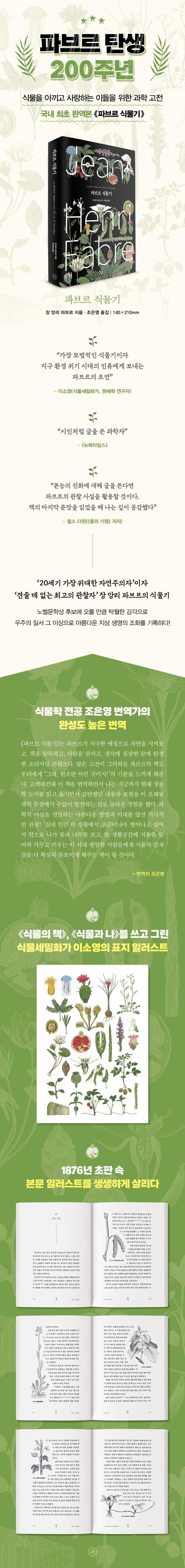 식물을 아끼고 사랑하는 이들을 위한 과학 고전자연과의 접점을 잃어버린 기후 위기 시대의 인류에게150년 전 파브르가 다정한 조언을 건네다20세기의 위대한 자연주의자 장 앙리 파브르는 《파브르 곤충기》로 널리 알려졌지만, 그가 식물학 박사 학위를 받고 식물을 깊이 연구했다는 사실을 아는 이는 많지 않다. 그의 책 《파브르 식물기》는 지상 생명의 아름다운 조화를 흥미진진한 서사로 보여주는 과학 고전이다. 찰스 다윈이 “견줄 데 없는 최고의 관찰자”라고 극찬한 파브르의 시선은 그전까지 배경과 도구로 취급되었던 식물을 마이크로코스모스의 당당한 주인공으로 격상한다. 노벨문학상 후보에도 올랐던 그의 문장은 친근한 비유와 다양한 사례를 곁들여 식물의 구조와 기능 등 다소 어려울 수 있는 지식을 흥미롭게 설명한다. 파브르 탄생 200주년을 맞아 국내 최초 완역본으로 출간하는 《파브르 식물기》를 통해 독자는 새로운 시선으로 식물을 사랑하는 방법을 배울 수 있으며, 나아가 희미해진 자연과의 접점을 선명하게 체험하는 놀라운 경험을 누리게 될 것이다.1. 왜 파브르는 ‘곤충기’ 출간 3년 전, ‘식물기’를 출간했을까?— 자연과 괴리된 현대인에게 서로 얽히고 의존하는 생명의 이치를 전하다파브르는 자연과학 제일의 가치인 ‘관찰’의 대가답게 몇십 년 동안 지구 전체 동물 가운데 4분의 3이나 차지하는 곤충의 삶을 꾸준히 주시하며 이에 대한 글을 10권의 책으로 썼다. 그 유명한 《파브르 곤충기》다. 이와 더불어 수억 년 동안 곤충과 함께 공진화해온 식물이 그의 관심사와 맞닿는 것은 어쩌면 당연한 수순이다. 그의 박사 학위 논문 또한 〈도마뱀난초의 괴경에 관한 연구〉가 아니던가. 《파브르 곤충기》 제1권이 출간되기 3년 전인 1876년에 파브르는 이 책 《파브르 식물기》를 출간했다. 앞서 1867년 출간했던 《나무의 역사(Histoire de la Buche)》에 2부가 추가된 구성이었다.식물을 다루는 책으로는 이례적이게도 《파브르 식물기》에는 곤충뿐만 아니라 산호와 해파리 등 다양한 동물에 관한 이야기가 등장한다. 파브르는 식물과 동물이 서로 영향을 주고받으며 공유하는 생명의 이치에 주목했다. 그의 눈에 땅 위에는 생명의 조화를 담은 작은 우주, 마이크로코스모스가 펼쳐져 있었다. 이 책을 시작하는 1장 〈산호와 나무〉에서 그는 다음과 같은 문장으로 이야기를 시작한다. “식물은 동물의 자매다.”파브르는 이 책의 1부에서 식물의 현재를 조명하고 2부에서는 식물의 미래로 우리를 이끌어간다. 자연의 전체적인 서사 속 식물과 동물의 관계에서부터 시작한 식물의 이야기는 점차 깊숙한 곳까지 독자를 이끈다. 식물계 전체의 범주와 각 범주의 상세한 특징, 식물을 구성하는 기본 구조인 뿌리‧줄기‧잎의 화학적 특성과 기본 요소 등을 살펴보고 마지막으로 다시 한번 이 모든 특징들이 땅 위의 다른 생명체에게 미치는 영향을 짚어낸다. 서로서로 얽힌 생명체들의 이야기를 따라가다 보면 그간 외울 것투성이로만 느껴졌던 식물에 대한 각종 과학적 사실이 단순한 자료의 나열이 아닌 자연의 맥락 속에서 길어 올려진 것임을 생생하게 이해하게 된다.누구보다 높은 자연에 대한 이해와 유려한 문장을 동시에 겸비한 파브르의 책은 오늘날 자연과의 접점을 잃어가다 끝끝내 기후 위기를 맞이하게 된 현대인들에게 많은 질문을 남긴다. 빼어난 관찰자였던 파브르는 인간의 속도와는 다르게 흘러가는 곤충과 식물의 세상을 이해하기 위해 누구보다 그 관계성에 주목했던 과학자다. 식물 또한 동물과 마찬가지로 세상과 소통하며 살아남기 위해 고군분투한다. 자연이라는 거대한 맥락 속 식물과 곤충 나아가 인간까지 돌아보게 하는 그의 글은 다시금 자연주의적인 태도가 필요해진 지금 시대와 조용히, 그리고 오래 공명하고 있다.눈은 가족의 일원이자 공동체의 주민이자 식물 사회의 단위체다. 그러나 이런 미성숙한 상태로는 갓 태어난 이 연약한 시민이 달리 할 수 있는 게 없다. 이듬해 봄에 잎이 달린 가지가 되기 전에는 나무의 전반적인 활동에 참여하지 못한다. 그때까지는 그저 젖먹이 어린애로 지내며 공동체의 희생으로 먹고살아야 한다. 포대기에 싸인 갓난아기나 둥지 속 새끼 새처럼 많이 먹고 튼튼하게 자라는 것 말고는 할 일이 없다. 노동은 모두 잎이 무성한 새 가지, 즉 그해에 돋아난 가지에 온전히 맡겨진다. 이 가지가 공동체를 부양한다. 뿌리를 통해 흙에서 빨아올리고 잎을 통해 대기에서 끌어내린 원료를 배합해 끈적한 수액을 만든다. 식물 세계에서는 모든 것이 이 수액으로 창조된다. 해가 바뀌면 한 해 동안 수고한 가지는 말하자면 은퇴를 선언하고 휴식에 들어간다. 그리고 지금의 눈이 잎과 가지로 자라서 이듬해 새로운 눈이 대체할 때까지 부지런히 공동의 일을 수행한다. 그렇다면 나무는 여러 세대가 해마다 차례대로 업무를 이어받는 조직체와 다름없다.- 1부 2장 <식물의 개체> 중에서먹고 먹히는 이 일련의 과정 중에 누구의 노동이 가장 칭찬받아 마땅하다고 생각하는가? 인간은 몸의 재료를 양에게서 빌렸다. 양은 이미 준비된 상태로
