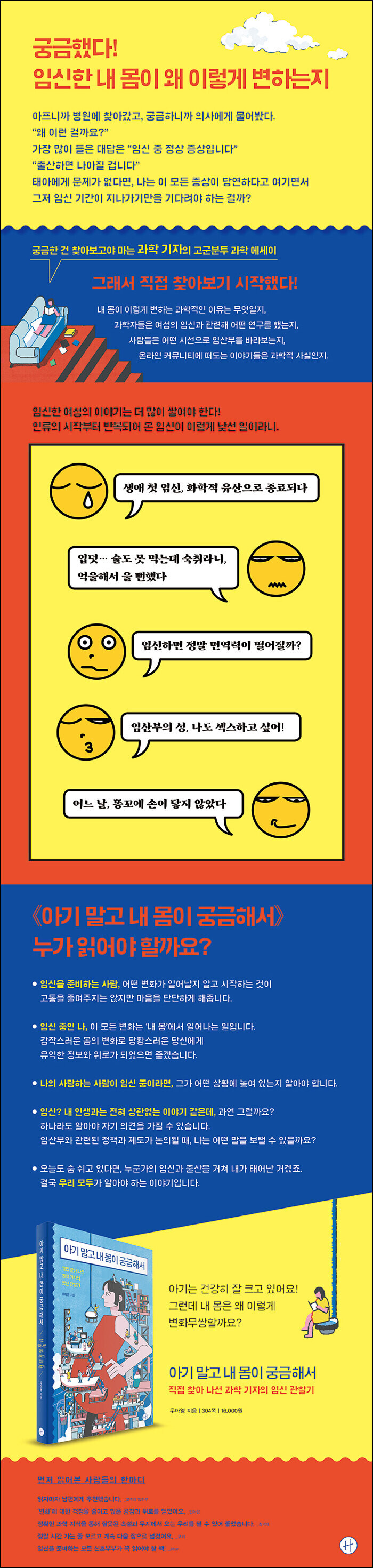 임신 중 겪은 예상치 못한 몸의 변화"임신 때문에" 그렇다는 뻔한 대답이 아닌, 왜 그런지 알고 싶었다첫 임신이 화학적 유산으로 종료되고 아무렇지 않을 거다, 대부분 모르고 지나간다는 의사의 말과 달리 극심한 통증에 시달리면서 의문이 생겨났다. “임신한 여성의 신체적·정신적 변화는 왜 아무도 자세히 말해주지 않는 걸까?” 많은 여성이 임신 기간 중 겪었던 몸의 변화를 가장 당혹스러운 기억으로 꼽는다. 임신 후 처음 겪는 통증, 변화하는 몸 때문에 문제가 생길 때마다 병원에서 가장 많이 들은 이야기는 “임신 중 정상 증상입니다” “출산하면 나아질 겁니다”였다. 대다수의 임산부가 비슷한 경험을 반복하면서 의사에게 질문하기를 스스로 멈춘다. 태아에게 아무런 문제가 없다면 임산부의 신체적·정신적 변화는 임신 과정에서 당연히 겪는 부차적인 것으로 여기는 현실, 괜찮은 걸까?《아기 말고 내 몸이 궁금해서》는 태아가 아닌 임산부의 몸의 변화와 임신 부작용에 관해 이야기하는 과학 에세이다. 병원에서 ‘정상’이라는 내 몸은 왜 이렇게 아픈지, 과학자들은 여성의 임신과 관련해 어떤 연구를 했는지, 커뮤니티에 떠도는 이야기들은 과학적 사실인지 과학 기자로 일한 저자가 자신의 몸과 관련해 생긴 궁금증의 답을 찾기 위해 고군분투한 기록이다. 저자가 임신 기간 중 겪었던 증상과 맞닥뜨린 문제에 대해 24가지의 주제로 풀어냈다.1. 배 한가운데에 생긴 봉제선, 숙취 같은 입덧, 꼬리뼈 통증…당혹스러운 몸의 변화, 왜 그런 걸까요?유방이 아프기 시작하고 숙취 같은 입덧이 찾아온다. 꼬리뼈 통증에 시달리고 배 한가운데에는 인형 봉제선 같은 임신선이 생겨난다. 조금만 움직여도 숨을 헐떡이게 된다. 임신 초기에는 쏟아지는 졸음 때문에 고생했는데 후기에는 잠드는 것마저 힘든 일이 된다. 임신 주수가 늘어날수록 날마다 새로운 증상과 마주한다. 진료실 의자에 앉아 통증을 호소하는 임산부 앞에는 “그럴 수도 있다”라는 의사의 답변이 반복될 뿐, 왜 그런지에 대한 자세한 설명은 생략되어 있다. 이유도 모른 채 견뎌야 하는 통증은 물리적 고통과 맞먹는 또 다른 형태의 고통과 불안으로 다가온다.임신하면 왜 더울까, 왜 체중은 예상과는 다르게 늘어날까, 왜 유방이 커질까, 왜 성욕이 변화할까, 왜 두통이 생길까. 저자는 신뢰할만한 연구자와 논문을 참고하여 나름의 답을 찾아 나선다. 어느 날, 그는 화장실에서 항문에 손이 닿지 않아 크게 당황한다. 한껏 부른 배 때문에 신발을 신기 어렵거나, 상체를 숙이기 어려울 거라곤 예상했지만, 이런 상황에 닥칠 줄은 몰랐기 때문이다. 가까스로 위기 상황을 모면하고 이 문제는 과연 어디서부터 찾아보기 시작해야 하는지 생각한다. 임산부의 생체역학에 대한 연구는 찾아보기 힘들었다. 비만인의 관절 가동범위에서 관련 내용을 발견해나간다. 이런 웃픈(?) 상황들 속에서 ‘임신한 내 몸’을 이해하기 위해 과학적인 근거를 찾아가며 자신의 이야기를 솔직하고 유쾌하게 풀어나간다. 저자가 직접 그린 그림과 함께 경험을 바탕으로 한 임신·출산 용어 해설을 덧붙였다.체온의 변화마저 호르몬 때문이라니. 임신한 뒤 나타나는 신체적·정신적 변화에 ‘급변하는 호르몬 탓’이라는 말은 이제 나도 할 수 있을 것 같았다. 근본 원리가 궁금해졌다. 도대체 프로게스테론은 어떻게 임산부의 체온을 올리는 걸까? (……) 실험 결과, 프로게스테론 호르몬을 주입했을 때 시각교차앞핵에 있는 뉴런들의 활동이 뉴런 종류에 따라 줄거나 늘어났다. 연구팀은 “이 뉴런들의 활동 변화가 ‘기준온도’를 높이는 것 같다. 직간접적으로 프로게스테론이 시각교차앞핵의 온도 감지 뉴런에 영향을 미쳐 기초체온이 높아지는 것 같다”고 결론을 내렸다. _119~120쪽, 〈왜 이렇게 더운 걸까?―체온〉 중에서출산 전까지 누워만 있을 게 아니라면 이런 고난이도(?)의 행동을 어쨌든 해내야만 하고, 그 부담은 관절의 몫이다. 의자에서 일어날 때 무릎 관절에 미치는 힘을 계산한 연구에 따르면, 출산 후보다 임신 중일 때 무릎 관절에 미치는 힘이 30% 넘게 더 컸다고 한다. 임신과 출산을 겪으면 무릎이 나간다는 말이 괜한 게 아니었다. 임산부는 이 사실을 본능적으로 알고 있기라도 한 걸까? 배가 나올수록 팔자걸음을 걷게 되는데, 팔자걸음이 실은 무릎 관절의 부담을 줄여준다고 한다. 연구에 따르면 일반 걸음이나 안짱걸음보다 팔자걸음을 걸을 때 ‘무릎 내전 모멘트’가 더 작았다. _192~193쪽, 〈어느 날 똥꼬에 손이 닿지 않았다―관절〉 중에서2. 여성의 몸과 관련한 ‘생산되지 않는 지식’더 많은 이야기를 찾아내고 싶었다저자는 과학과 사회의 관계 속에서 ‘생산되지 않는 지식’에 대해 주목했다. 이를테면 여성의 몸에 대한 지식은 다른 몸에 대한 지식보다 더 적게 생산된다는 것을 말이다. 발암물질 생리대 파동 때 여성용품의 안전을 점검하는 기사를 쓰면서 의심은 확신으로 바뀌어갔다. 그리고 임신 중 겪은 다양한 몸의 변화에 대한 답을 찾아가면서 다시 한번 절감했다.일반인이 접근할 수 있는 임산부와 관련된 지식 정보는 충