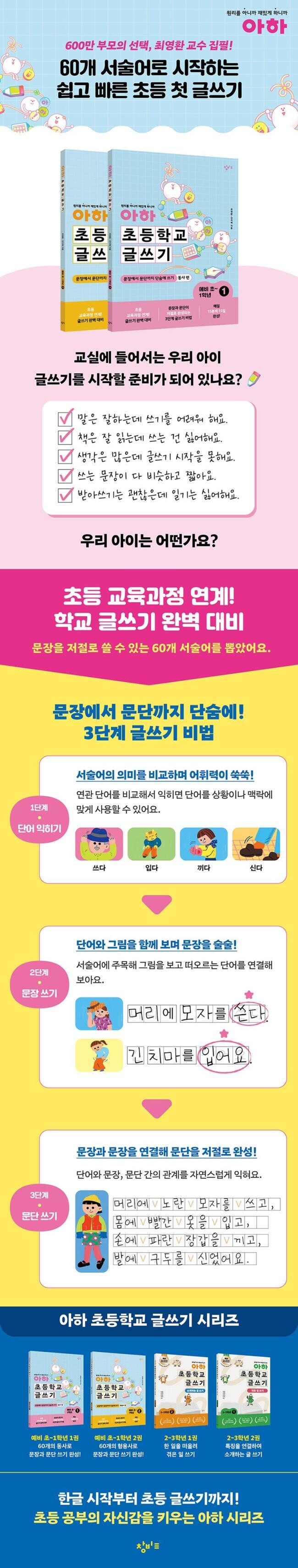 이 책을 집필한 최영환 교수님은 『기적의 한글 학습』과 『아하 한글』 시리즈로 무려 600만 부모님의 선택을 받은 ‘한글 학습 분야 1위 저자’입니다. 『아하 초등학교 글쓰기: 예비 초~1학년』은 예비 초등학생과 1학년 학생들을 위한 책으로, 글쓰기를 처음 시작하는 아이들이 기초부터 탄탄하게 문장과 문단을 쓰는 연습을 합니다. 이를 통해 단어에서 출발에 문장과 문단을 저절로 완성하며 글쓰기를 쉽고 재밌게 시작할 수 있습니다.
