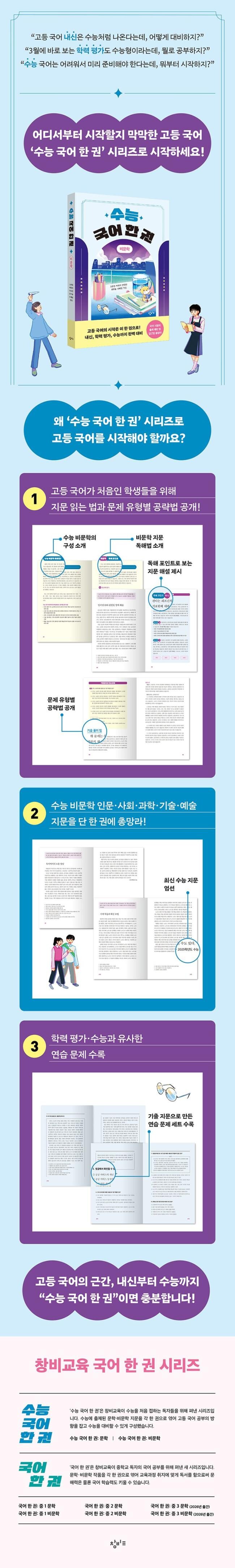 ‘수능 국어 한 권’은 수능에 출제된 문학·비문학 지문을 각 한 권으로 엮었다. 최근 10여 년의 기출을 분석하여 최신 수능의 경향을 잘 보여 줄 수 있는 지문을 골랐다. 고등학교 국어 공부는 결국 수능을 향해 있기에 수능을 철저히 분석한다면 고등학교 국어 공부의 다른 두 축인 내신과 전국 연합 학력 평가에도 대비할 수 있다. 이를 위해 ‘수능형 문제’에 학생들이 익숙해질 수 있도록 대표 기출문제와 오직 ‘수능 국어 한 권’을 위해 집필된 상세한 해설을 수록했다. 기출 지문을 기반으로 하여 수능과 유사하게 구성한 연습 문제도 제공해, 학생들이 수능과 고등학교 국어 공부를 향한 첫걸음을 자신감 있게 뗄 수 있도록 구성했다. 지문을 엄선하는 과정부터 지문 및 문제 해설, 연습 문제 출제까지 모두 현직 고등학교 국어 교사들이 진행하여 전문성과 현장성 역시 높였다.
