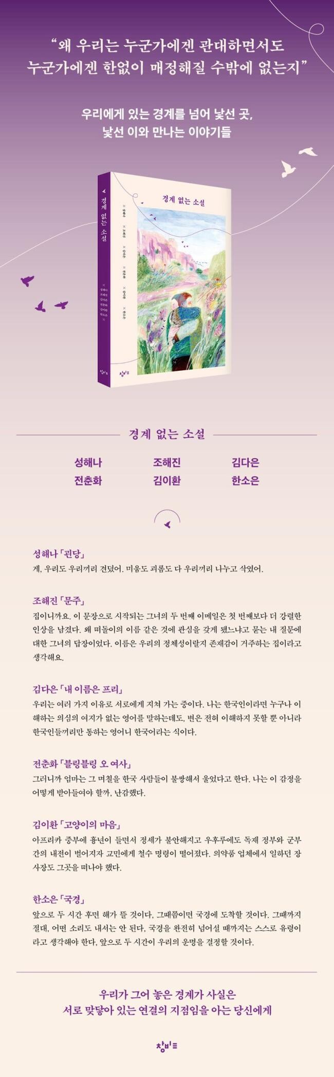 다문화를 테마로 한 단편 소설 6편을 엮은 『경계 없는 소설』이 출간되었다. 소설집에는 성해나, 조해진, 김다은, 전춘화, 김이환, 한소은 작가가 그려 낸 다양한 문화와 사람들에 관한 이야기가 담겨 있다. 우리는 누구나 자신이 선택하지 않은 특정한 환경에서 태어나고, 그 경계에서 공동체를 이루며 정체성을 형성한다. 구성원들은 기쁨과 슬픔을 나누며 서로 끈끈한 유대감을 키우지만, 이러한 강력한 결속력이 이방인에게는 때로 높고 배타적인 벽으로 느껴질 수도 있다. 그럼에도 인간은 한자리에 정착해서만 살지 않았다. 사회적 위협이나 자연재해를 피해, 혹은 더 나은 삶을 찾아 인류는 끊임없이 길을 떠나는 생존의 여정을 선택해 왔다.