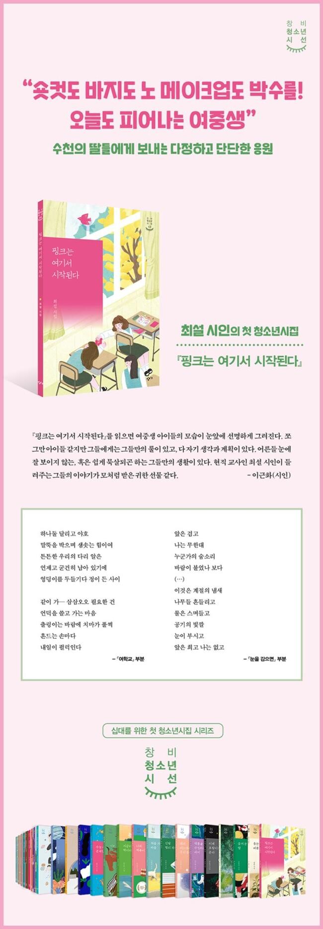 『핑크는 여기서 시작된다』를 읽으면 여중생 아이들의 모습이 눈앞에 선명하게 그려진다. 쪼그만 아이들 같지만 그들에게는 그들만의 룰이 있고, 다 자기 생각과 계획이 있다. 어른들 눈에 잘 보이지 않는, 혹은 쉽게 묵살되곤 하는 그들만의 생활이 있다. 현직 교사인 최설 시인이 들려주는 그들의 이야기가 모처럼 받은 귀한 선물 같다.