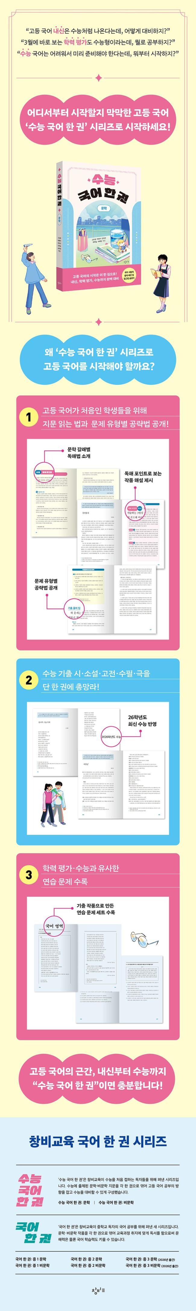 『수능 국어 한 권: 문학』은 수능에 출제된 시·소설·고전·수필·극 등 여러 갈래의 문학 작품을 한 권에 담고, 갈래별로 묶었다. 각 갈래별로 첫머리에 ‘독해 포인트’를 제시하여 문학 작품을 읽는 법을 알려 주고, 작품별로 ‘독해 포인트’에 기반한 해설을 제시하여 학생들이 기출 작품에 익숙해지도록 했다. ‘독해 포인트’를 체화하면 낯선 작품도 어렵지 않게 해석할 수 있다. 주요 수록 작품으로는 2026학년도 수능 출제 작품인 고재종 시인의 「감나무 그늘 아래」와 2025학년도 수능 출제 문학 작품 중 하위 문항들의 오답률이 높았던 고전 소설 「정을선전」 등이 있으며 총 36작품을 수록했다.