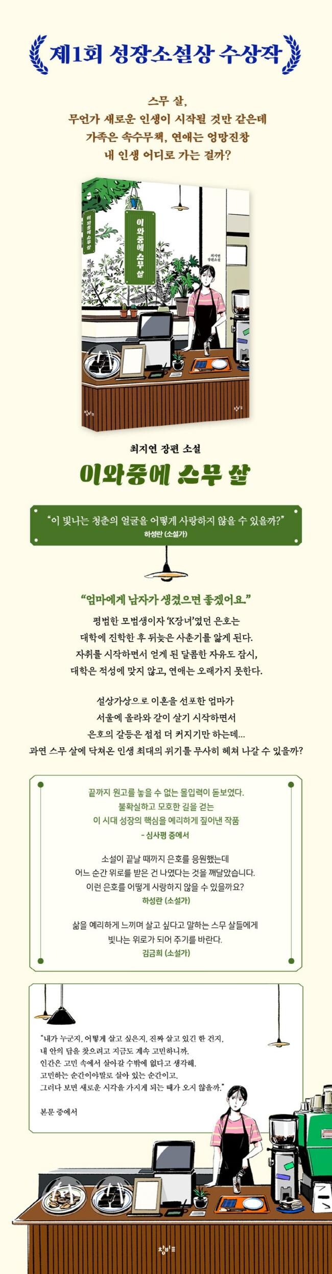 “한차례 내린 비에 쑥 자라는 풀처럼 나는 한순간에 철들고 있었다.”(43쪽) 은호는 어린 시절 엄마가 자식들을 먹여 살리기 위해 고생하는 모습을 보고 더 이상 떼를 쓰지 않게 되었던 기억을 떠올리며 이런 소회를 털어놓는다. 그러나 이러한 ‘철듦’은 진정한 의미의 성장이라기보다는 어른 흉내 내기에 가깝다. 최지연 작가는 부모와 학교, 사회의 요구를 내면화하여 실천하는 것이 성장이 아니라 내면의 힘을 키우고 독립적인 인간으로 홀로 서는 것이 진짜 성장이라고 말한다. 자신이 진정으로 원하는 바가 무엇인지 알고 이를 실현하려 노력하는 것이 어른이 되는 길이자 제대로 살아가는 방법이라는 것이다. 성장은 다다르면 끝나는 목표가 아니라 끊임없이 노력해 가는 과정이기 때문이다. 어느 날 문득 미치도록 살고 싶어졌다는 은호의 말에 윤지 선배는 살고 싶다면 먼저 죽어야 한다고 답한다. 일견 선문답처럼 보이는 이들의 대화는 성장소설의 고전 『데미안』에 등장하는 격언을 떠올리게 한다. “새는 알을 깨고 나오려 힘겹게 싸운다. 알은 세계이다. 태어나고자 하는 자는 세계를 깨뜨려야 한다.” 100인의 독자 심사단이 작품 중 가장 인상적인 문장으로 뽑아 준 “고민하는 순간이야말로 살아 있는 순간”(55쪽)이라는 표현 역시 흔히 부정적인 것으로 치부되곤 하는 고민과 갈등, 방황의 가치를 되새겨 보게 한다. 막연히 성장이라고 하면 2차 성징을 겪는 청소년기에 종료되는 것으로 생각하기 쉽지만 현대 사회에서 인간은 쉼 없이 성장하고 변화해 간다. 창비교육의 성장소설상은 이처럼 삶에 정해진 길도 없고, 앞서 살아간 인물 중에 역할 모델을 찾기도 쉽지 않은 오늘날 저마다의 자리에서 성장해 가는 사람들의 이야기에 의미를 부여하기 위해 제정되었다. 제1회 성장소설상 대상을 받은 최지연 장편 소설 『이 와중에 스무 살』은 한창 성장통을 앓고 있는 청소년부터 불안과 혼란으로 가득했던 이십 대의 기억을 생생히 간직하고 있는 성인까지 두루 공감하며 읽을 수 있는 성장소설이다. “외부의 답이 아닌 내 안의 답을 찾으려고 지금도 계속 고민하는”(54쪽) 독자라면 고군분투하는 은호를 응원하는 동시에 스스로에게도 위로와 격려를 보내게 될 것이다.