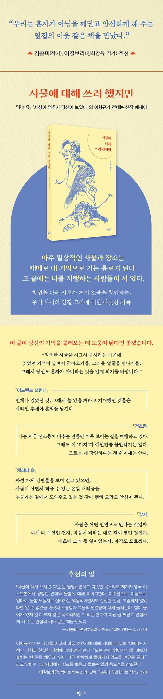 저자는 일상의 익숙한 물건과 장소, 시기를 통로 삼아 ‘지금의 이향규’를 만들어 준 인연들과의 구체적 추억을 소환했지만, 장애인 인권, 돌봄 노동, 남북 분단, 전쟁의 비극, 비거니즘, 동물권 등 사회적 이슈에 대한 저자의 사유 또한 자연스레 드러난다. 주변으로 관심을 돌려 일상을 관찰할 때조차도 사회의 응달에 주목하는 이향규 특유의 시선이 돋보인다. 이렇게 독자는 사물에 얽힌 저자의 과거 기억을 따라 시간과 공간을 넘나들다 보면 우리 눈에 미처 보이지 않았던 사실, 곧 우리 이웃들이 어떻게 서로를 보살피고 공동체의 든든하게 결속시키고 있었는지 비로소 보이게 된다. 이 점에서 『사물에 대해 쓰려 했지만』은 사회적 목소리가 담긴 에세이를 기다려 온 독자들에게도 울림 있는 읽기 경험을 선사할 것이다.