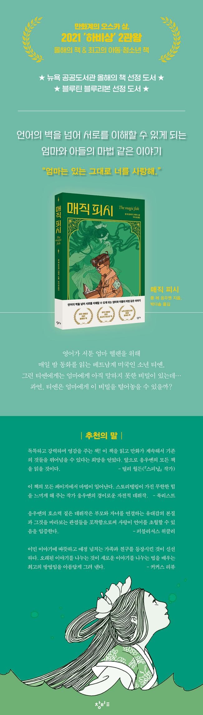 작가 쭝 레 응우옌은 자전적 경험을 담은 《매직 피시》로 데뷔하자마자 2021 아이스너 상 최우수 작가상과 2021 영국 판타지 문학상 베스트 코믹/그래픽 노블 후보에 올랐다. 만화계의 오스카상인 하비상에서는 2021 올해의 책과 최고의 청소년 책 2관왕을 거머쥐었다.