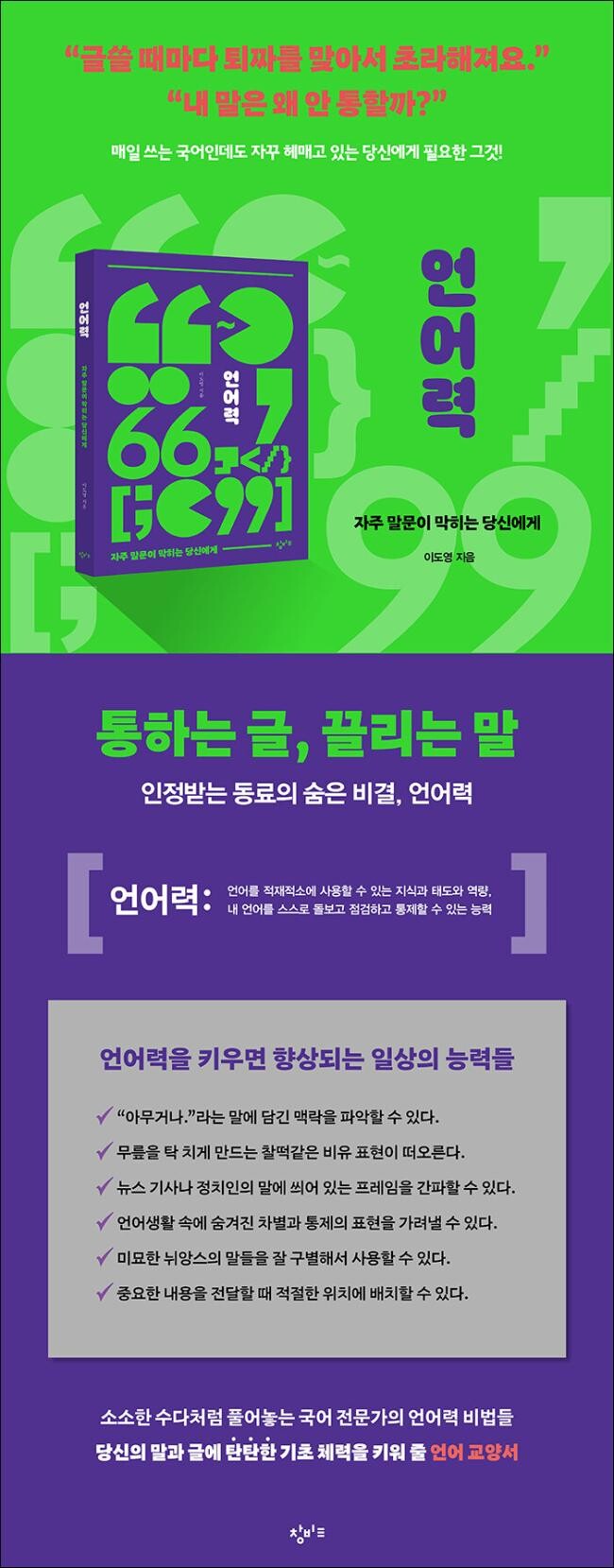 그래서 저자는 보통 삶과 관련된 예시를 통해 언어력을 유연하게 이해하는 책으로 만들고자 했다. 국어학 원칙에 충실하면서도 독자들이 문법에 매달리기보다는 평소 자신의 언어 태도와 감수성을 깨닫고 나아가 사회관계에서 자신만의 언어력을 다져 나갔으면 하는 마음으로 이 책을 썼다.
