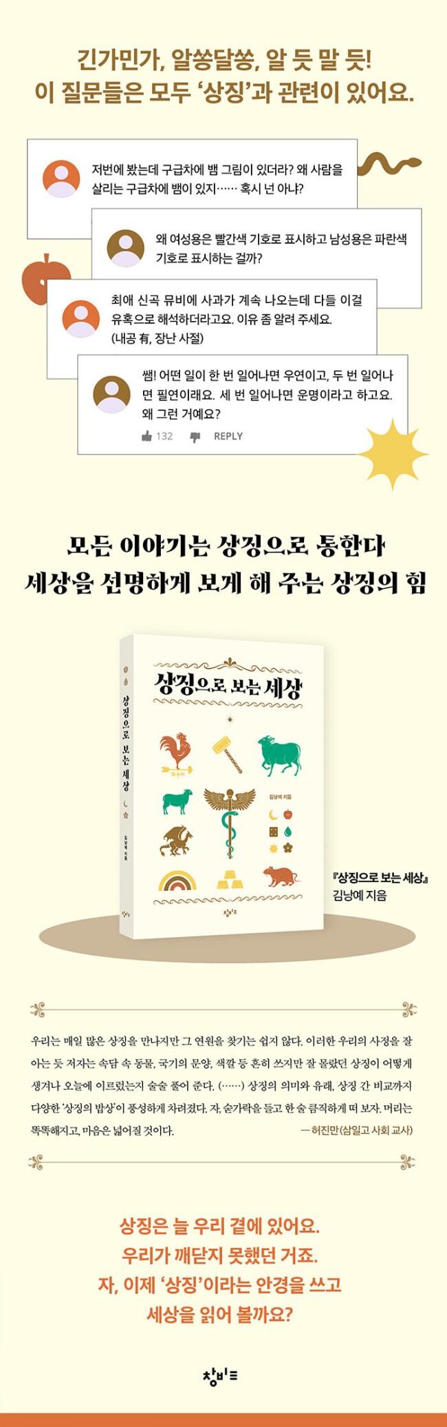이렇게 이 책에 나오는 질문에 대한 답과 풀이는 모두 상징과 연결된다. 우리 전통문화는 물론 다양한 종교와 신화, 철학과 세계사까지 아우르는 ‘상징 밥상’이 상다리가 휘어지게 차려졌다. 독자들은 손이 가는 대로 먹으면 된다.