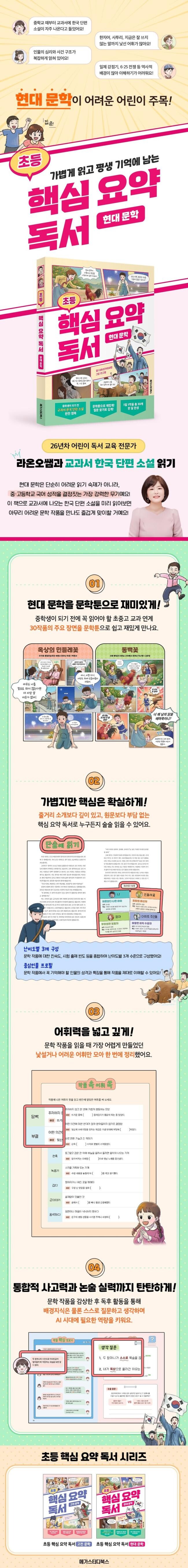 너무 간단해서 남는 게 없는 줄거리 소개에 실망해 본 적 있나요? 분명 읽었는데 대체 무슨 말을 하는지 몰라 답답한 적 있나요? 『초등 핵심 요약 독서 현대 문학』은 현대 문학의 주요 장면을 문학툰으로 만나고, 누구든지 문학 작품을 술술 읽을 수 있도록 도왔습니다. 현대 문학에서 꼭 기억해야 할 인물의 성격과 특징을 정리하고, 낯설거나 어려운 어휘를 익히면서 현대 문학을 가볍고 쉽지만, 제대로 이해할 수 있답니다.