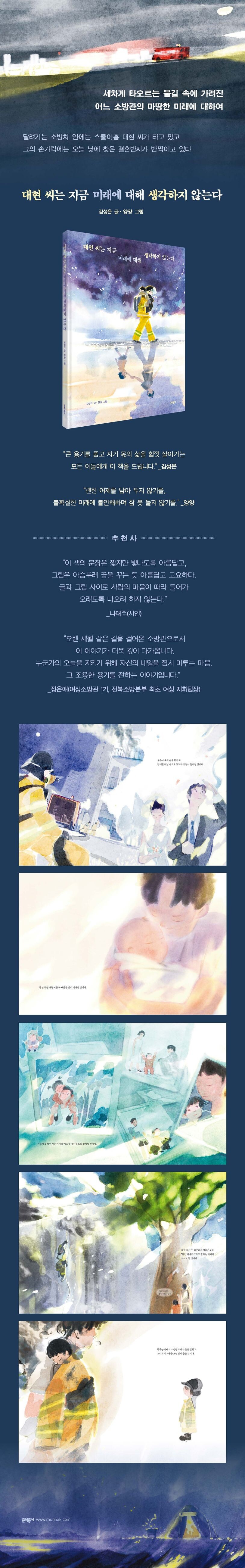어릴 적 우연히 화재 현장을 목격했던 김성은 시인은 그날 이후로 자신의 삶 한 편에 그 기억을 두고 오래오래 생각하게 되었다. 불 속으로 뛰어드는 소방관을 눈앞에서 보면서도 도대체 어떤 마음인지, 어떤 용기인지 감히 이해할 수 없었기에 언젠가는 꼭 그 이야기를 글로 쓰겠다고 다짐했다. 그렇게 그 마음은 동시가 되었다.