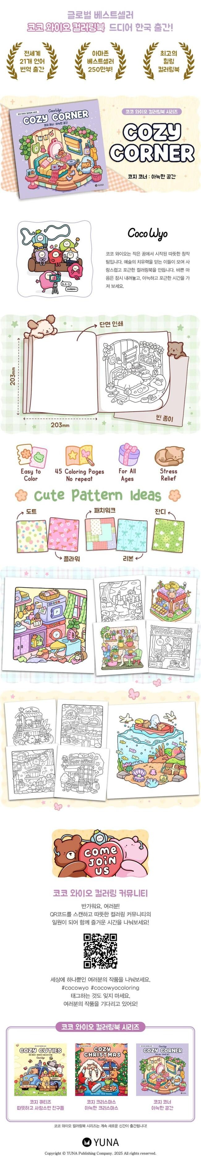 바쁜 하루 속에서 잠깐의 쉼표가 필요할 때, 색연필을 들고 마음이 가는 색으로 한 장을 채워보세요. 〈코코 와이오 컬러링북 시리즈〉는 단순한 컬러링북을 넘어, 당신의 하루에 따뜻함을 더해주는 작은 휴식의 공간이 되어줄 것입니다. 지금 바로 전 세계 250만 독자가 선택한 힐링 컬러링 경험을 만나보세요. 포근함과 귀여움이 가득한 〈코지 코너〉가 당신을 기다리고 있습니다.