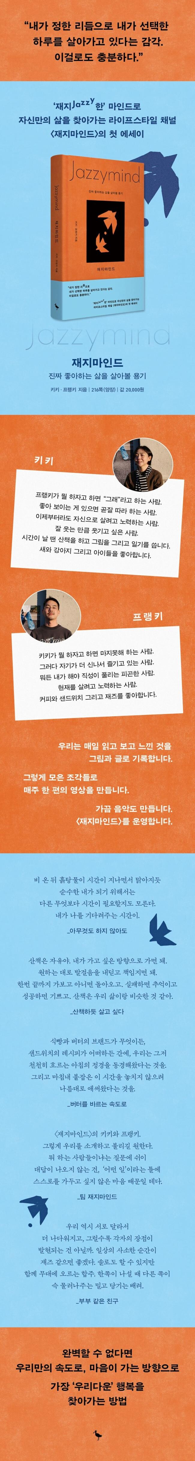 위대한 재즈 뮤지션 마일스 데이비스의 말을 인용하자면, “중요한 건 당신이 연주하는 음보다 연주하지 않는 음이다.” 유려한 선율만큼이나 음과 음 사이의 여백을 지켜내는 것이 재즈를 완성하는 핵심이라는 의미다. 이런 재즈 같은 삶을 살고 싶은 부부, 키키와 프랭키의 《재지마인드》가 도서출판 푸른숲에서 출간되었다. 동명의 유튜브 채널에서 서울 곳곳 고즈넉한 동네를 발길 가는 대로 산책하며 발견한 것에 대해 이야기를 나누거나 마음이 동하는 일들로만 오롯이 하루를 채워가는 두 사람의 모습은 보는 이들로 하여금 “보는 내내 미소가 지어진다”는 진심 어린 공감과 함께 “저렇게 살아보고 싶다”는 로망을 불러일으켰다.