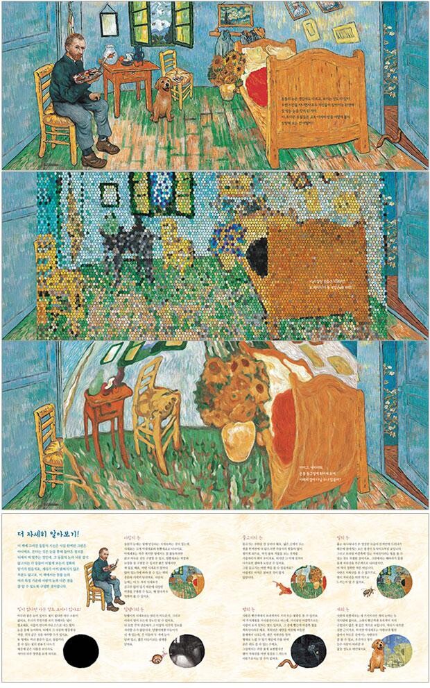 각 동물의 눈에 비친 고흐의 방은 어떻게 다를까요? 밝고 어두운 것만 겨우 구별하는 달팽이, 모든 것이 둥그렇게 휘어져 보이는 물고기, 이불 속에 숨어 있는 쥐를 볼 수 있는 뱀, 눈앞이 온통 모자이크처럼 보이는 벌, 파란색과 노란색밖에 볼 수 없는 개……. 각 동물이 본 서로 다른 고흐의 방이 독특한 계단식 구성을 통해 펼쳐집니다.