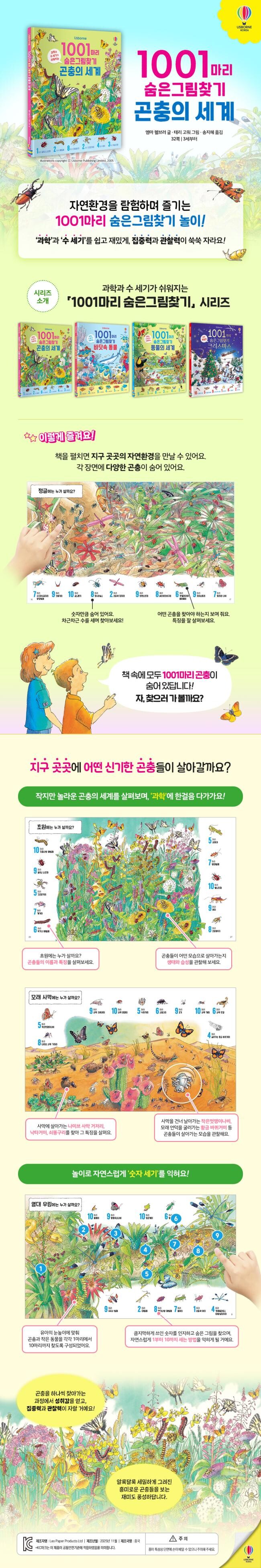 서로 다른 환경에는 각기 다른 생태계가 이루어져요. 여기에 살아가는 곤충들의 생김새와 특징도 다양하지요. 꽃밭의 노린재부터 열대 우림의 대왕 실잠자리, 사막의 낙타거미, 동굴 속 먼지벌레, 나비 정원에 모인 나비 등 놀랍고 신기한 곤충들을 만날 수 있어요. 곤충들의 이름과 생김새, 특징을 익히는 데서 나아가, 곤충들이 살아가는 모습도 관찰해 보세요. 땅속으로 파고들기도 하고, 물속을 헤엄치기도 하고, 기어다니던 애벌레가 날개를 가진 어른벌레로 변하는 등 다양한 모습을 살피며 자연스럽게 곤충들의 습성과 생태를 접할 수 있답니다.