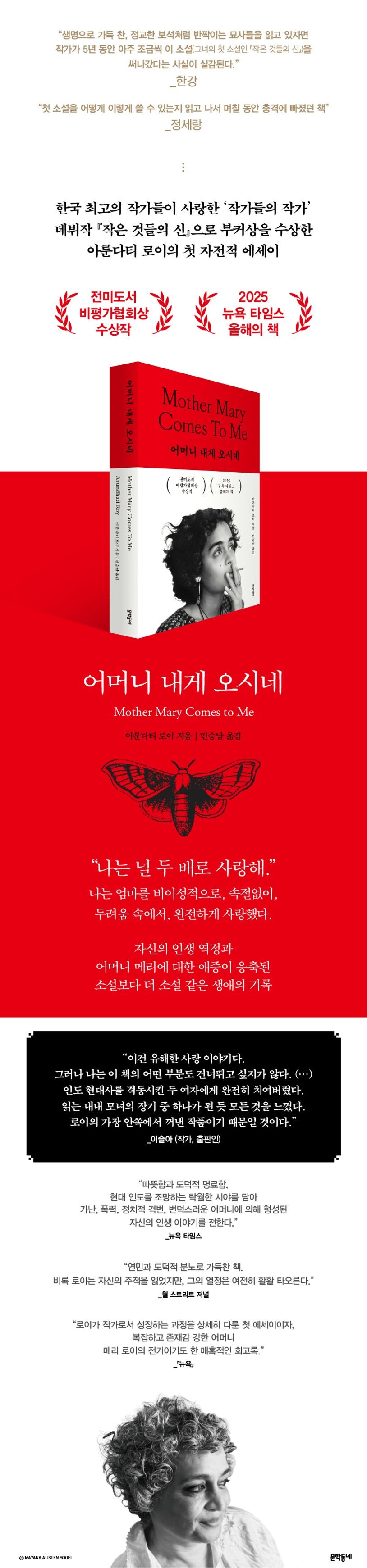 이 책의 번역가이자 『지복의 성자』를 우리말로 옮긴 민승남은 『어머니 내게 오시네』를 두고 “소설의 미학과 논픽션의 사실성이 절묘하게 어우러진 강렬한 서사”라고 평했으며, 『나는 울 때마다 엄마 얼굴이 된다』 『가녀장의 시대』를 쓴 이슬아는 “인도 현대사를 격동시킨 두 여자에게 완전히 치여버렸다”라는 말로 두 여성의 이야기를 강력히 추천했다. 이밖에도 한강, 정세랑, 편혜영 등 한국 최고의 작가들이 사랑한 ‘작가들의 작가’인 아룬다티 로이. 그녀가 처음으로 풀어낸 자신의 인생과 그것을 가능하게 했던 어머니 메리 로이의 삶에서 독자들은 또 다른 모습의 사랑을 만나게 될 것이다.