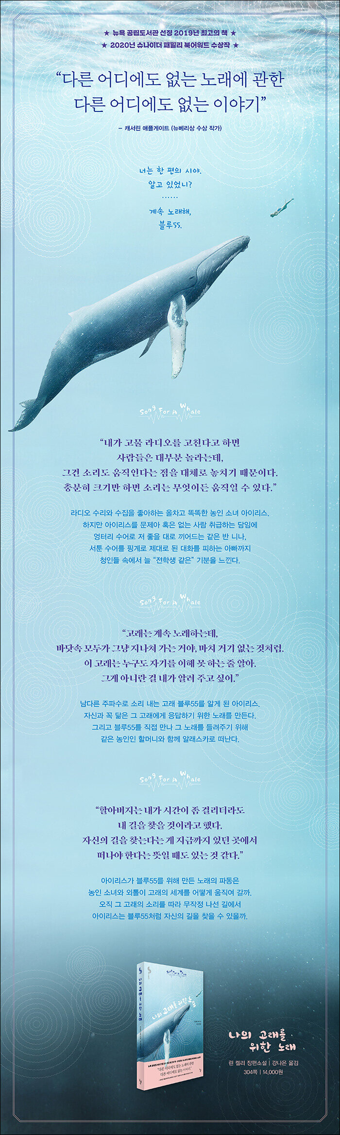 아이리스가 과학 시간에 블루55의 영상을 본 뒤로, 소설은 만난 적 없는 그 고래를 그리워하며 블루55에게 닿을 방법을 찾는 아이리스의 일인칭 이야기와 드넓은 바다를 다니며 자신의 소리에 응답해 줄 누군가를 찾는 블루55의 일인칭 이야기가 교차하며 진행된다. 작가는 서로 다른 두 세계를 능숙하게 항해하며 독자의 마음을 움직이는 진실한 소리의 파동을 만들어 낸다. 농인 소녀가 주인공인 책에서 라디오를 고치고 고래에게 들려줄 노래를 만드는 등 ‘소리’가 중요한 역할을 한다는 것이 의아하게 생각될지도 모른다. 하지만 이 책은 그것 역시 소리를 ‘귀로 듣는’ 것으로만 생각하는 청인들의 편견임을 꼬집는다.