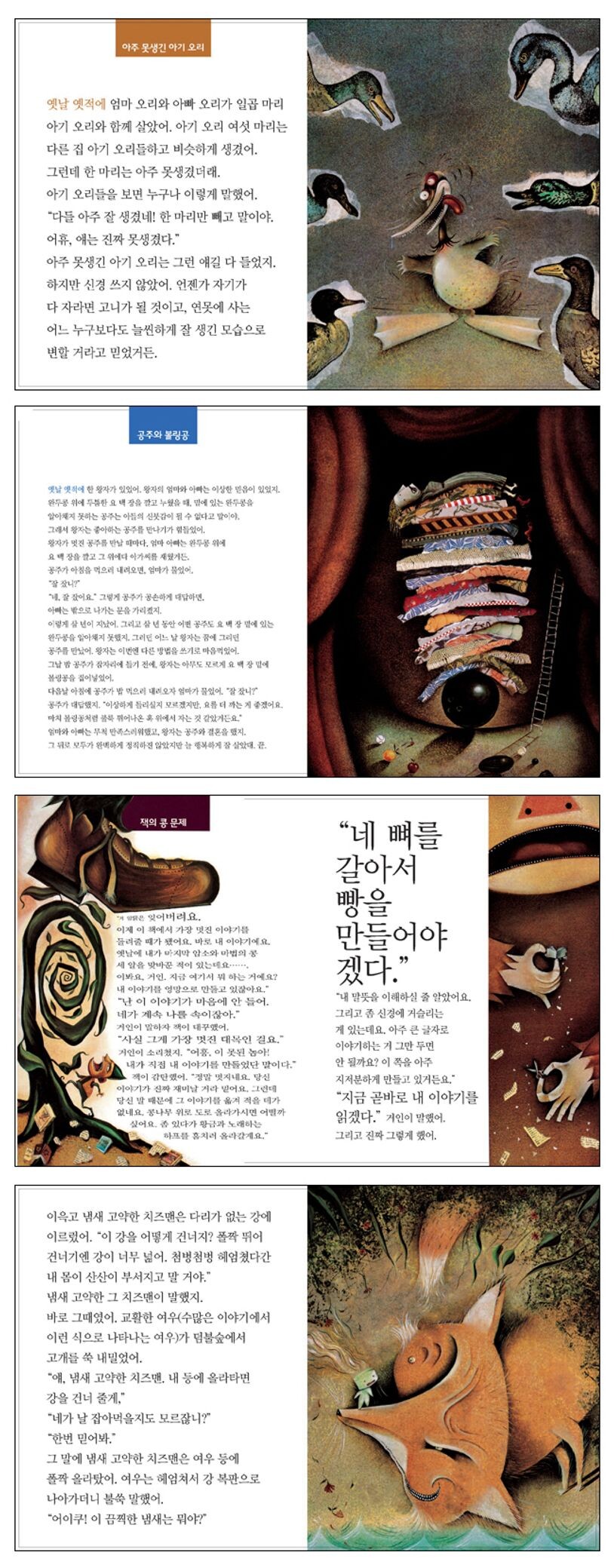 책 속에는 못생긴 미운 아기 오리가 정말 커서도 못생긴 오리가 되고, 공주는 개구리와 입맞춤으로 멋진 왕자님과 만나는 게 아니라, 개구리의 끈적끈적한 액으로 입이 더러워지고, 토끼와 거북의 경주에서는 거북은 토끼 대신 토끼의 머리카락과 경주와 잭과 거인의 이야기들이 10편이 나옵니다. 이처럼 책은 모두 10편의 이야기로 구성하였지만, 잭이 이야기를 엮어가는 1편의 이야기 그림책이기도 합니다.
