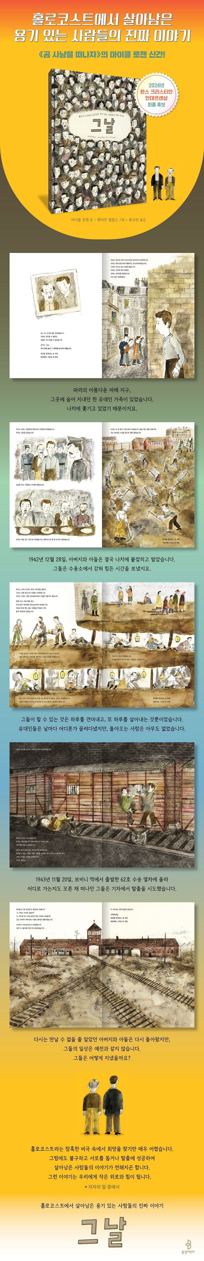 전 아동 문학상 수상자인 마이클 로젠은 외젠과 같은 수송대에 있었지만 돌아오지 못한 아버지의 삼촌과 숙모를 알게 된 후 이 이야기를 쓰게 되었습니다. 카네기 일러스트레이션 메달 최종 후보에 오른 벤자민 필립스의 강렬한 삽화가 돋보이는 이 감동적인 실화 그림책은 최악의 상황 속에서도 사람들의 가장 아름다운 모습을 일깨워줍니다.
